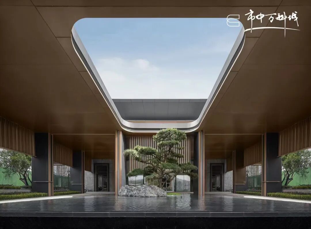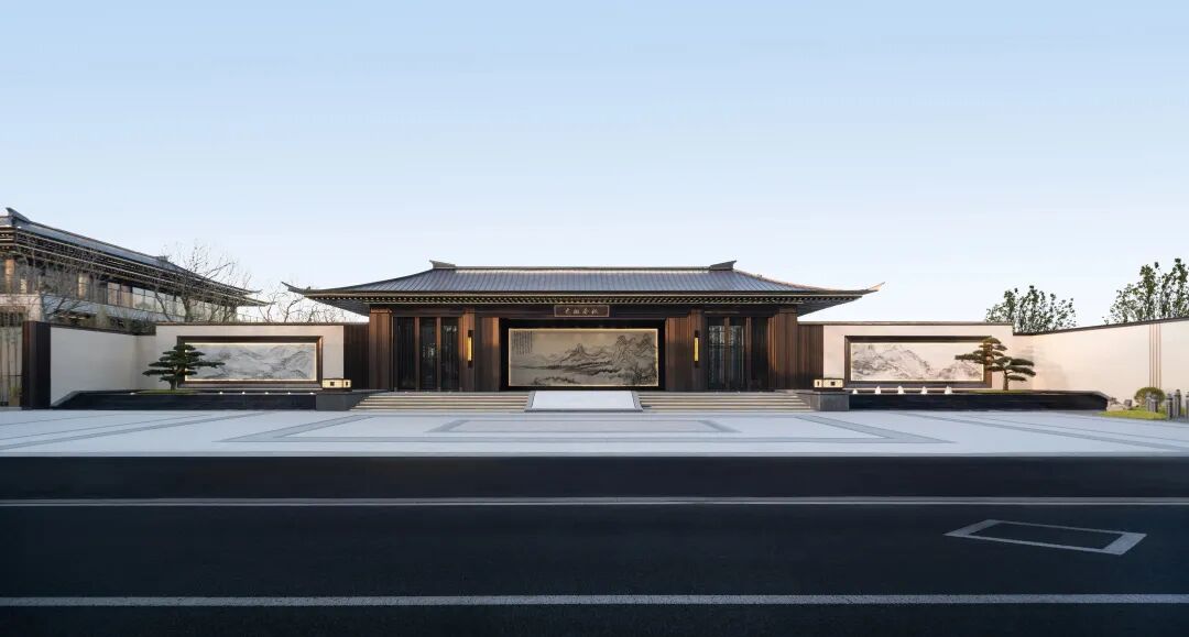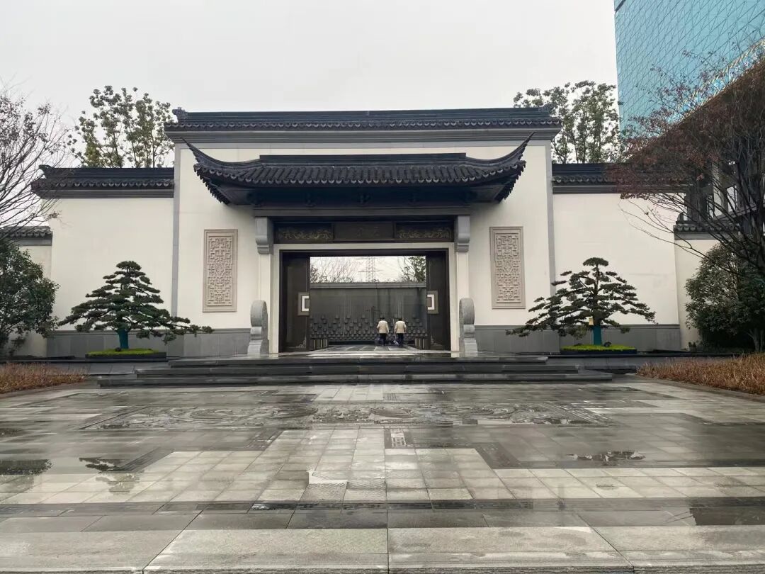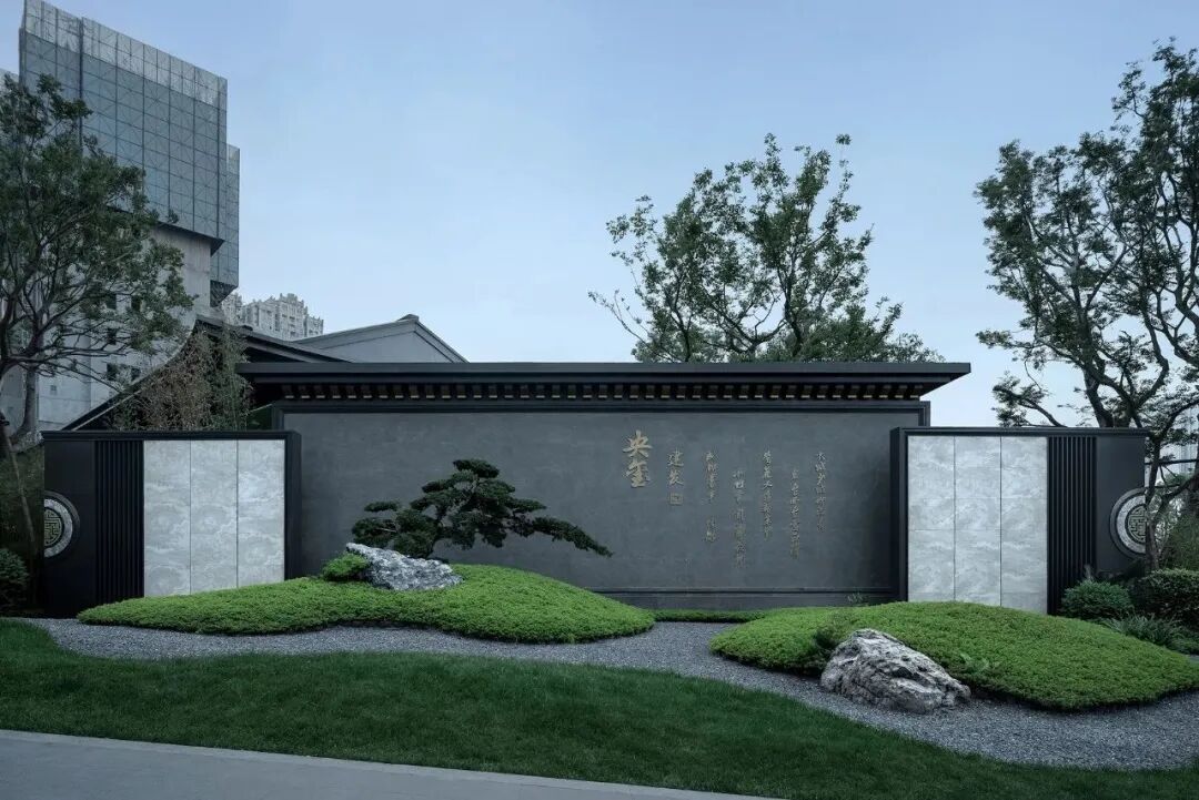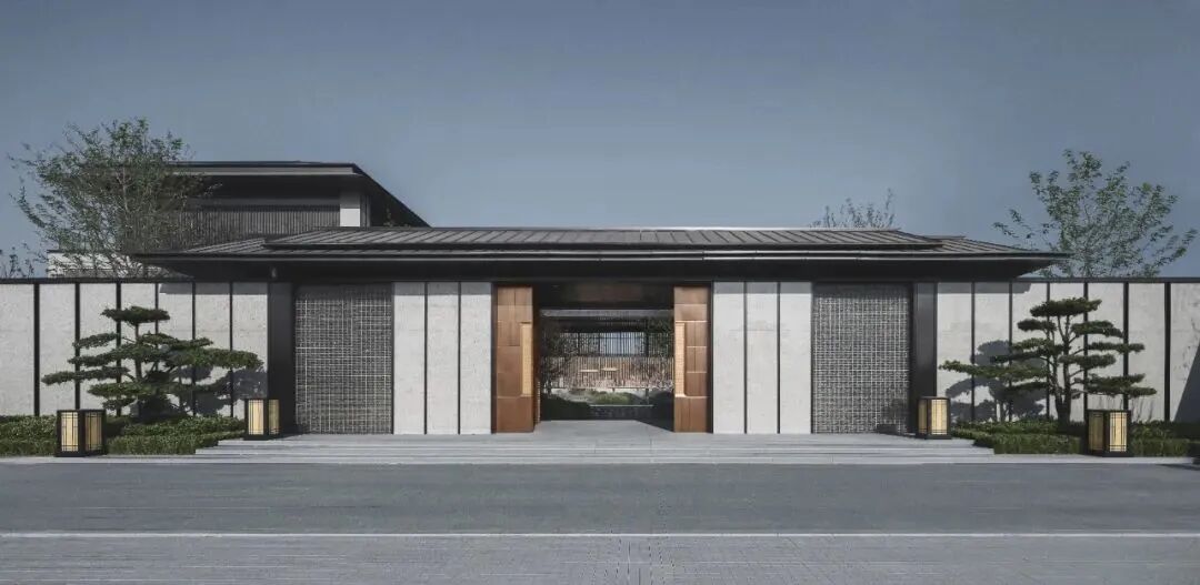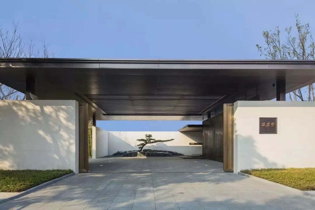 ——松为辅,突显门头的视觉效果,松的高度在门头高的1/2以,松的点位在门头两端或以内区域;或者结合景墙,拉大松与门头的距离,也能起到门头主景、松点缀的效果。