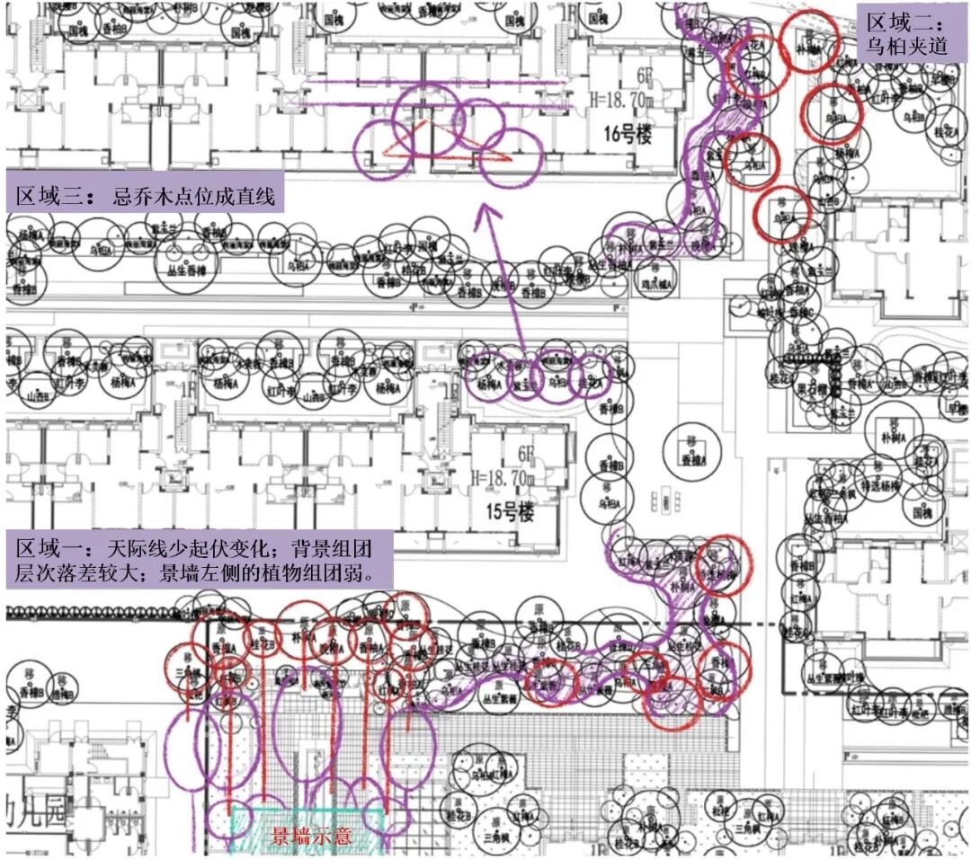 景墙与植物:植物一定要包裹景墙,背景植物有层次、有起伏变化的天际线;景墙两端要有植物来压边压脚(对于层次的搭配,可以用简单的线条快速复原立面效果,以此来复核设计效果(如图区域一);