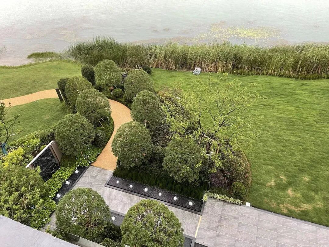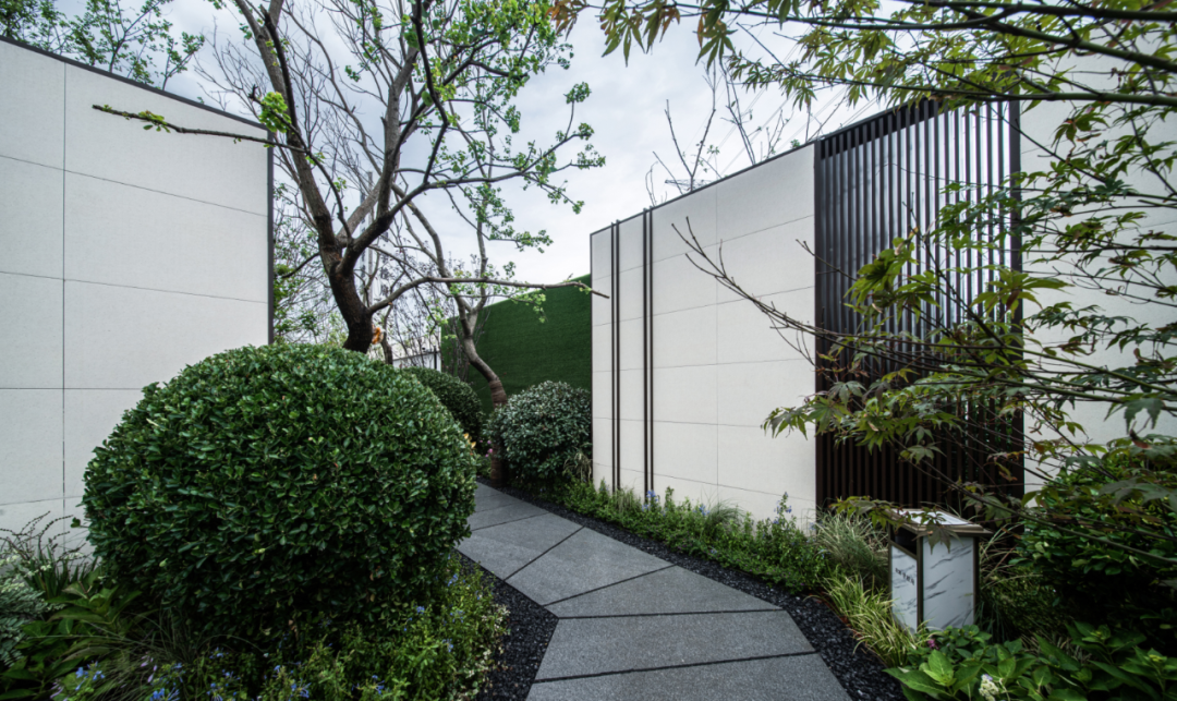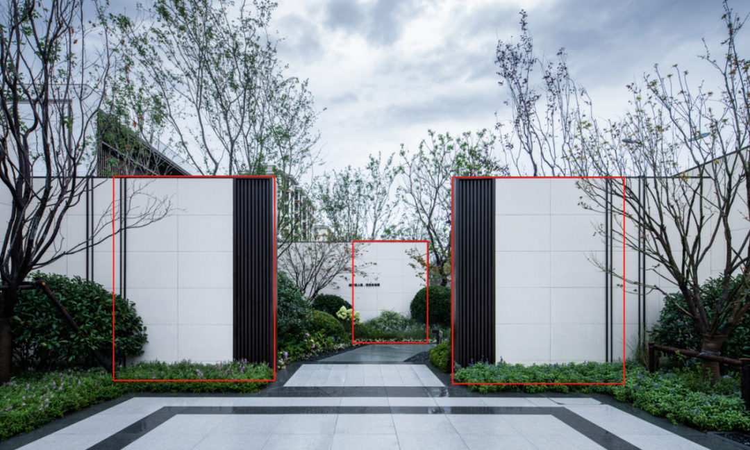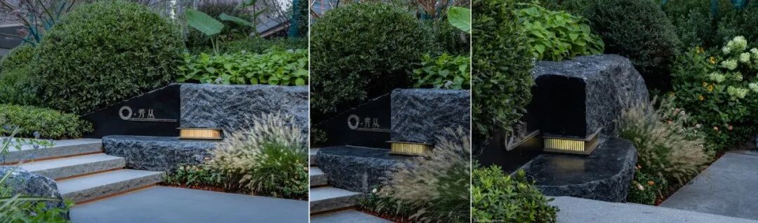 • 丰富的花境植物和绿篱与台阶、景石咬合串联,软与硬相融合,且主视线区域,花境中3株芒草的前置,更强调了统一性。