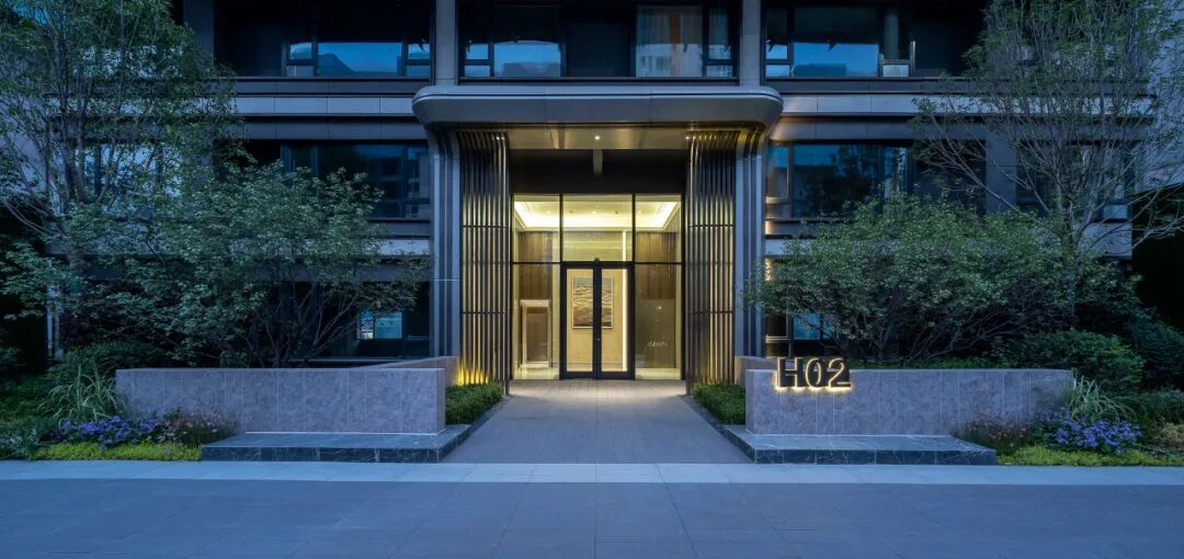 • 单元出入户的对称种植手法,大乔+花乔+球+地被,季相、组团结构清晰,变化中又有对植的两棵花乔作统一的调和,绿篱和铺装之间的砾石收边,更显细节和品质。