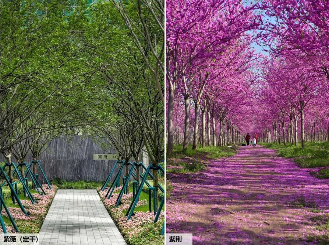 植物品种:丛生五角枫、香泡、元宝枫、蓝花楹、鸡爪槭、黄花风铃木、紫叶李、紫薇、山杏等