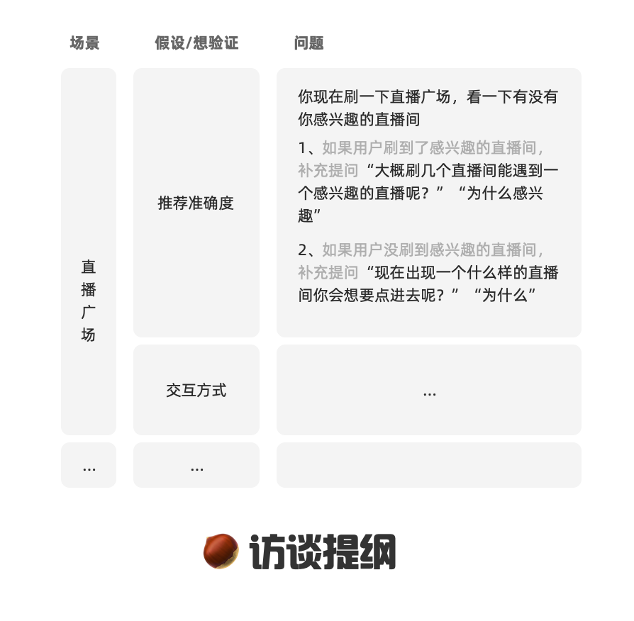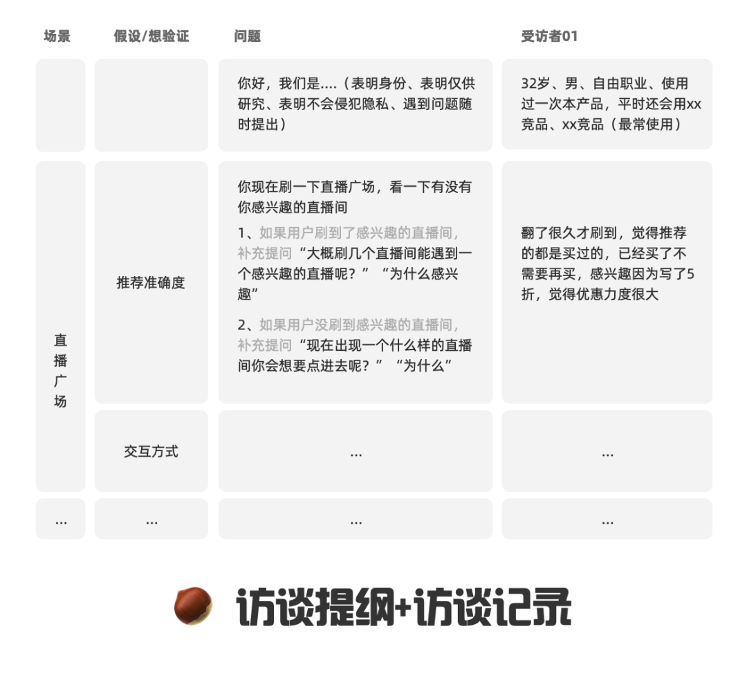 在这里想强调的是,实际用户访谈的时候我们一定要进行追问,所以在设计访谈问题的时候需要根据用户的几个不同表现设计不同的追问。例如当用户在访谈过程中有刷到感兴趣的直播间了,你可以追问“你大概刷几个直播间能遇到一个感兴趣的直播间呢”(量化推荐准确度),“你感兴趣的直播间都是哪些,为什么感兴趣”(强化推荐准确性),如果访谈过程中没有刷到感兴趣的直播间,那么你可以追问“如果现在出现一个什么样的直播间你会想要点进去呢”(了解产品没满足到用户的地方),然后根据用户的回答进一步追问“为什么”,基本就能得到用户期望补充的推荐维度或产品能力。以此类推继续对其他阶段做出假设、设计问题与追问,一份用户访谈大纲就可以成型了。我喜欢按如下的表格来输出访谈大纲,可以供大家参考一下: