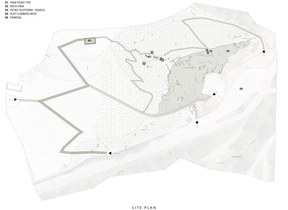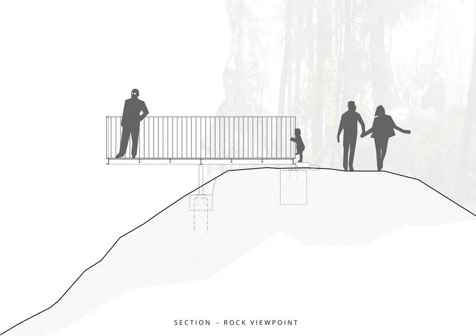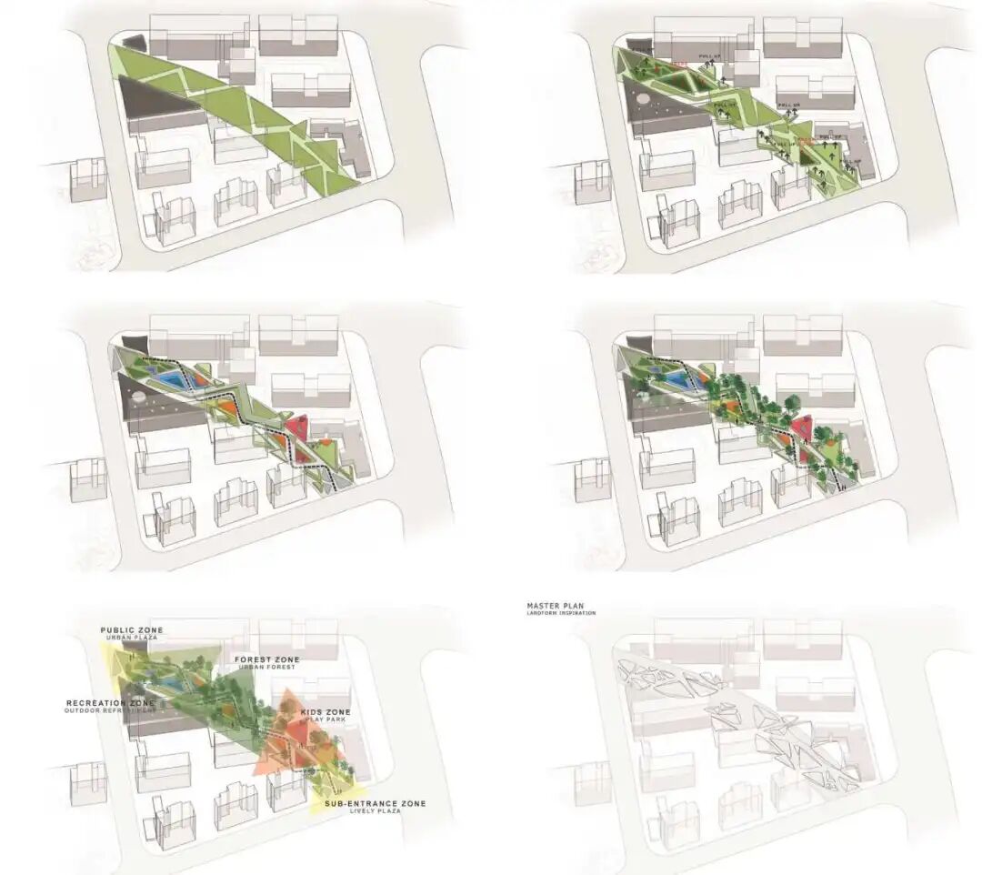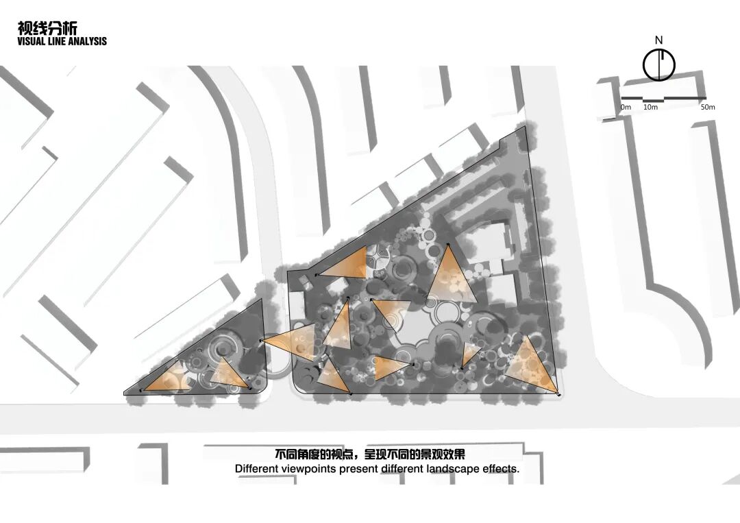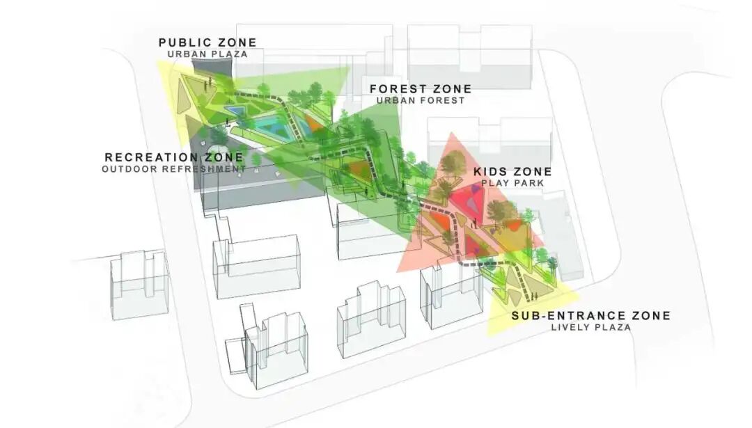 尽管场地受到局限,设计团队还是从中找到机遇,并提倡用三角的几何图形来解决场地问题。三角形的布局为景观设计带来三个优点。第一,三角形能有效利用建筑之间的角落空间。三角形可以根据场地空间分析成更小的三角空间,并填充不规则的空间。第二,三角形布局让场地更加四通八达,增加人流动线的效率。第三,三角形能增加几何图形的边界,从而增加使用者与景观互动的机会。
