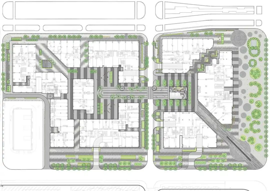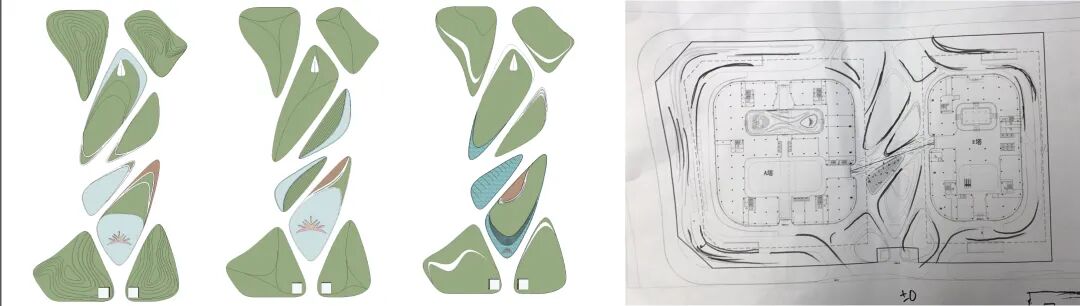 该项目位于天津南开区,靠近南开大学和天津大学。两个地块被一条三级道路分隔开来,建筑方案包括带有商业平台的办公楼。一条地铁线从地块东侧下方穿过,导致地铁站周围的部分景观推迟完工。