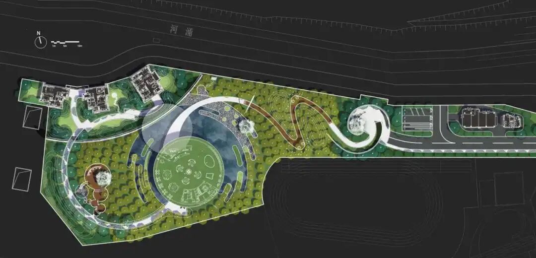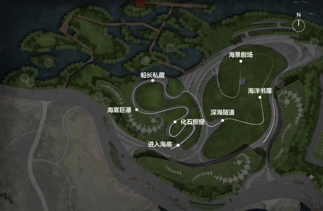 鹦鹉螺艺术馆的灵感来源于儒勒·凡尔纳的科幻巨作《海底两万里》,以海底活化石—鹦鹉螺为设计元素, Nemo船长带领众人乘坐潜艇进行海底探险为故事线,共赴一场鹦鹉螺艺术馆探险之旅,探寻东海地质演化史。方案总图以鹦鹉螺剖面所呈现的黄金螺旋线构图,建筑覆绿处理,让整个艺术馆就像一颗巨大的鹦鹉螺嵌在场地内,消隐于自然之中。景观空间进行下沉式设计,原因有两点:1.临港公园较为开阔平坦,靠海风大;2.下沉式的空间,可以更好的体验海底两万里所营造的情景感。