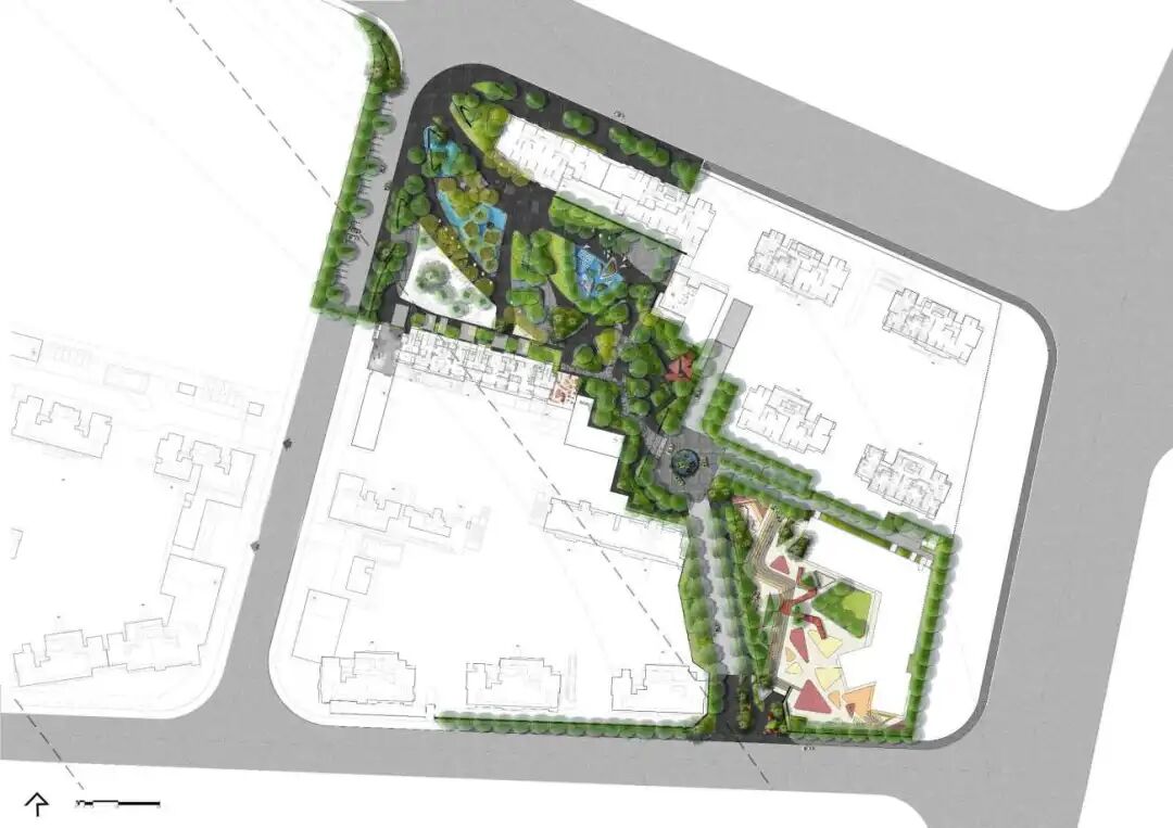 这次项目的景观设计是被公寓建筑包围的一个公共广场。项目的场地相对平坦。建筑物的布置让景观设计受到局限。由于广场是在整片地块的对角线上,加上建筑方正的排列,让景观范围呈现不规矩的多边形。