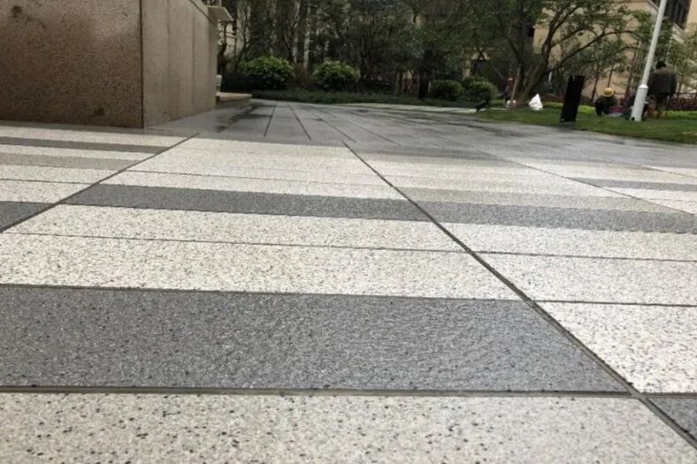 (2)面层无污染、无坑洼、无鼓包、无裂缝,无积水隐患;10 平方米内,必须有分隔缝(或用铺装抽条分隔),且分隔缝必须与收边铺装缝口连接;