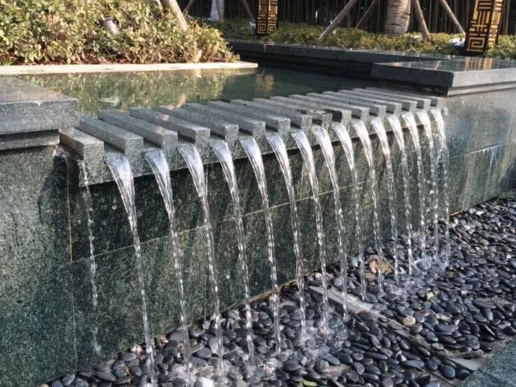 (5)跌水水口平滑顺直,出水平顺,无挂流或阴湿,避免水喷洒出水池外;如采用金属需要保证厚度及强度,一次成垄,避免焊接;
