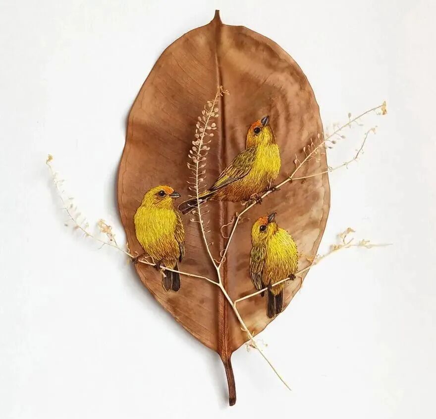 劳拉·达拉·维奇亚在干树叶上刺绣了各种各样的鸟类,每一只鸟都是不一样的,除了鸟类被她刺绣的形象逼真以外,为了增加真实感,她还在创作中增加了小木棍,形成鸟儿站在枝头的感觉,这下更立体更逼真了,这些可爱的小鸟,仿佛前一秒还稳稳地站在枝头,下一秒就要飞走了。