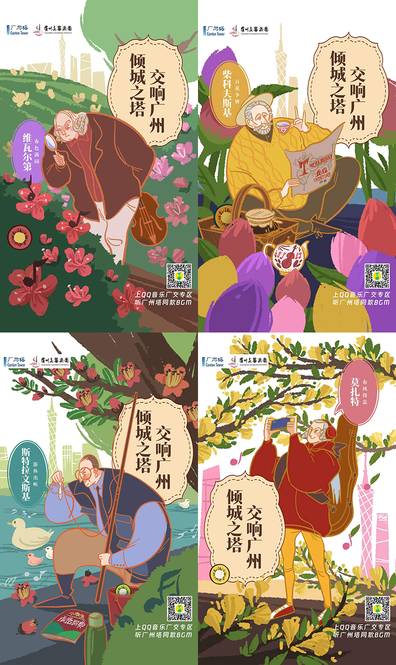 ▲ 上完手绘课, 学员因独特的手绘风格,就接到广州交响乐地铁插画海报的设计需求。海报展出后,因效果反馈特别好,甲方表示继续沿用这些人物形象,再设计一套线下活动的宣传物料。