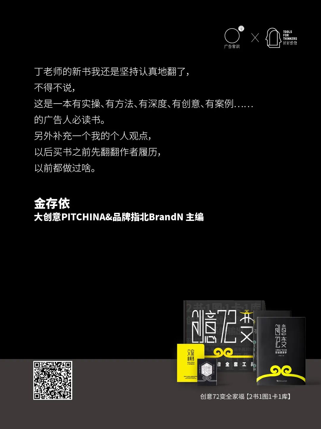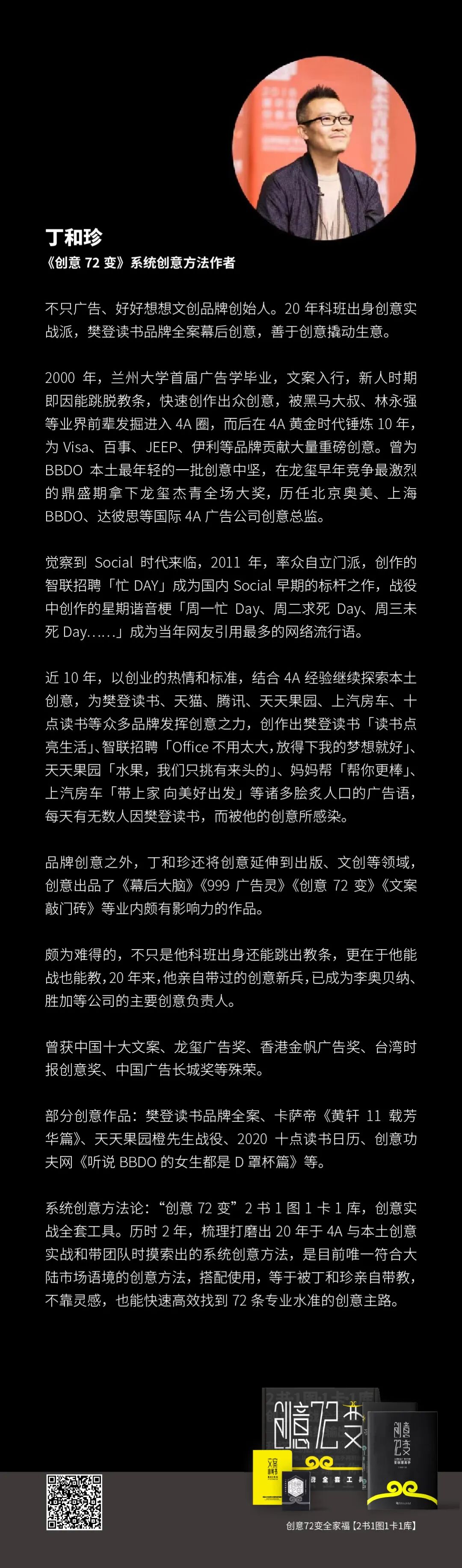 最重要的是,《创意72变》是基于视频广告而来,向平面H5等广告形式变通起来更容易,而开发全套实战的人,是一直战斗在一线的4A出身的资深创意大牛丁和珍,基于20年从业经验总结而来,超级实用、经典又时新。