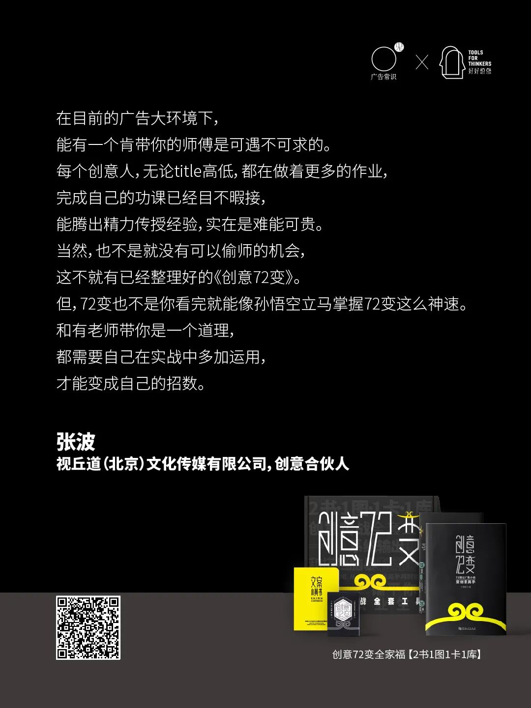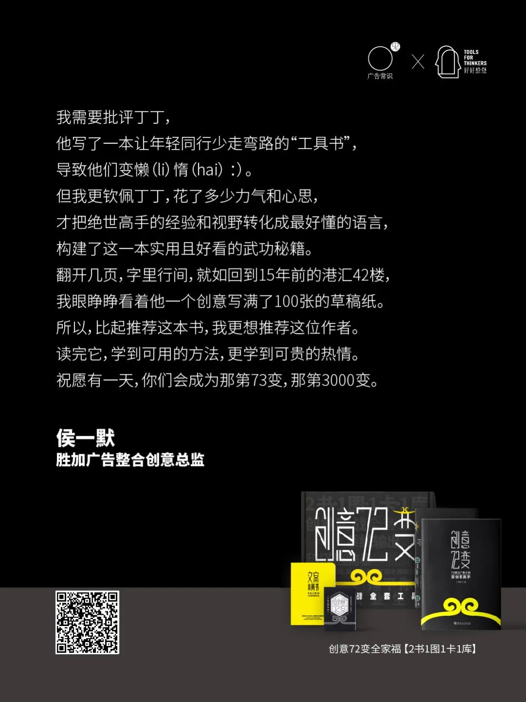 这72变,是丁和珍在奥美、BBDO、电通等国际4A工作和自己创业后,不断锤炼和传承下来的。众多他眼中的大牛的创意手法,也被总结出来,经他之手,这全套创意实战工具,凝练的是业界不同代之间的创意智慧。