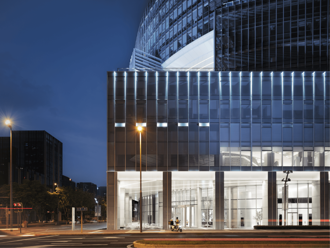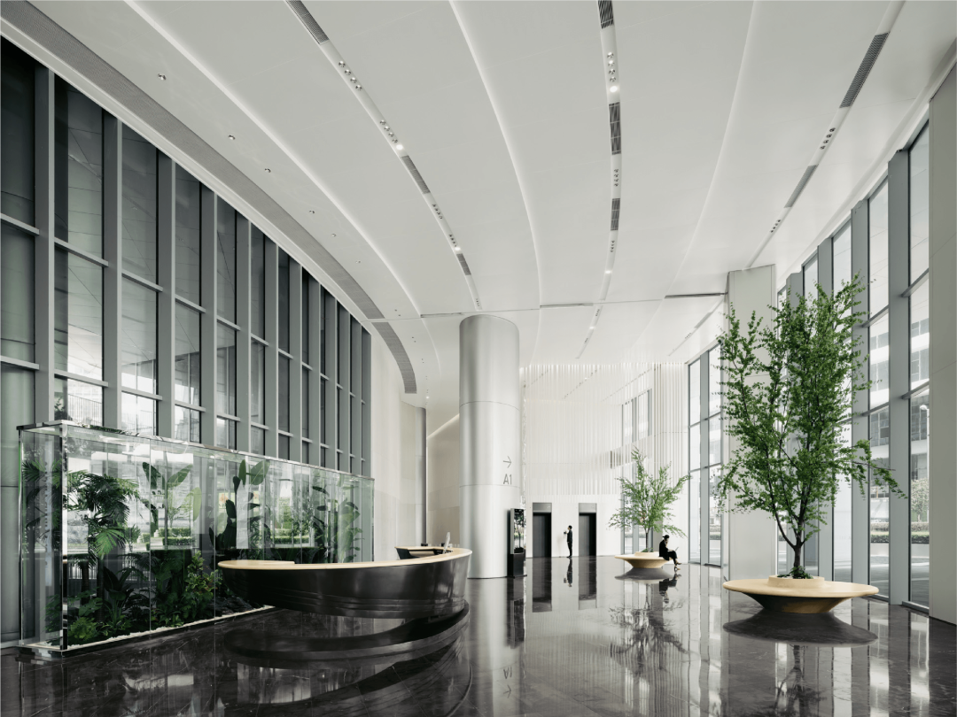高新创合中心以半开合圆弧状建筑形态,以流动柔和的姿态融入周边方格网状的城市肌理,在对比中与周边环境形成对话,打造出全新的生态城市和商务空间。