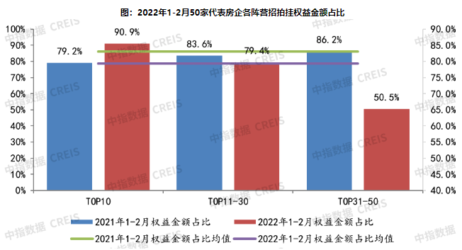 2022年1-2月,50家代表房企招拍挂权益金额占比均值为79.4%,较同期降低3.6个百分点,企业倾向合作拿地。