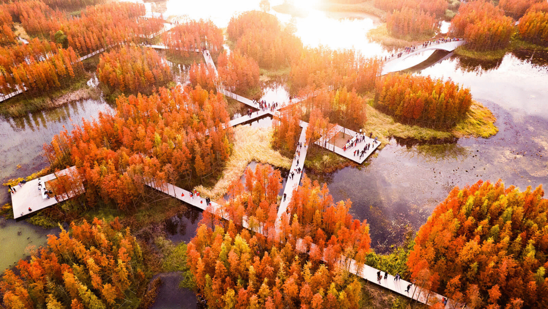 由俞孔坚提倡的海绵城市理念,现在已经被全世界所认同,俞孔坚领衔的“土人设计”的新项目——南昌市鱼尾洲公园是新的海绵城市典范,以“水上森林”的设计策略,回收了场地内的粉煤灰,构建出了数个生态岛屿,种植能够在水位涨落中生存的树种和大量湿地植被。这个项目在2022年获得了美国建筑大师奖(The Architecture MasterPrize)城市设计年度大奖,以及2022 AZ Awards的景观设计大奖和环境领导力人气奖,得到了全世界的肯定。