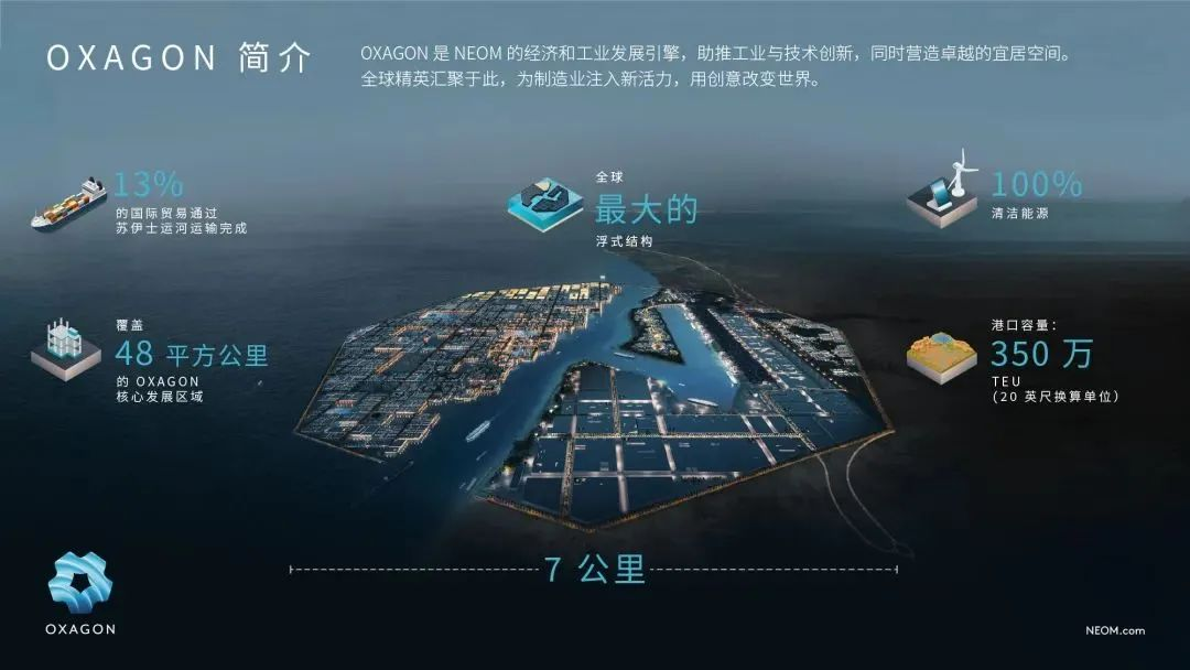 沙特阿拉伯还发布了另一个“重量级”方案——OXAGON八边形城市,将在红海的海陆连接处建立一座全新的港口城市,这座城市呈八边形,其同心圆的直径约为7千米,拥有占地约20平方千米的海上构筑物。