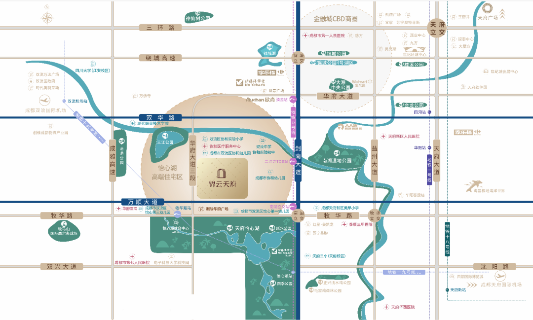 |首先看区位优势|锦云天府位于怡心湖主要居住组团的核心位置,西侧是中国铁建西派国樾、城投绿城诚园、金地悦澜道、中海云麓世家的高端林立;东侧是中海右岸、保利叶语、融创南湖逸家的大牌云集,居所易得,圈层难觅,锦云天府单从区位来看就已经赢在起跑线上。