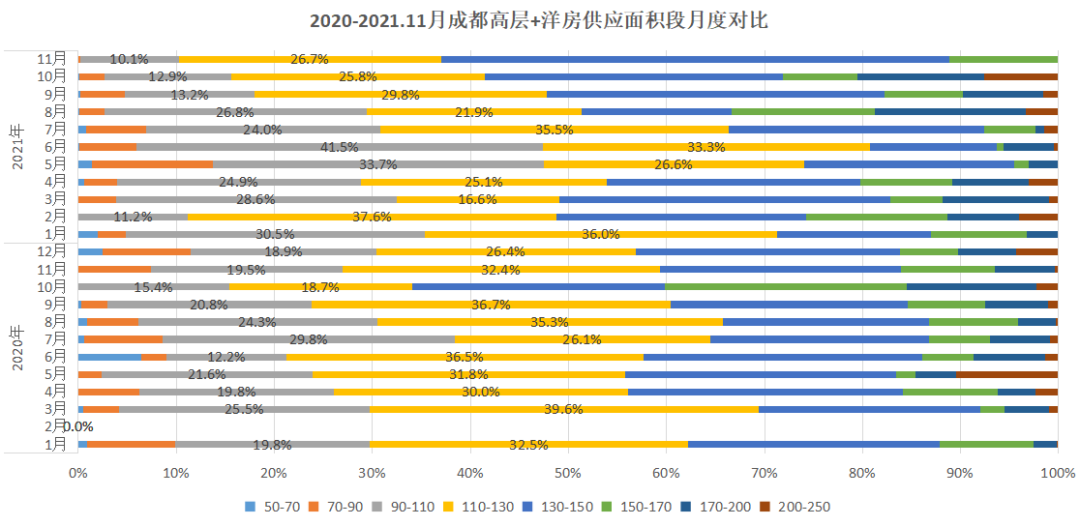 来自四川中原地产的数据显示,对比近两年成都高层+洋房供应面积段月度数据,我们能看到,进入2021年,90-110㎡产品的供应占比明显增多,于2021年6月达到占比41.5%的峰值,要知道,整个2020年,90-110㎡的刚需面积段供应最高占比的月份也没超过30%。