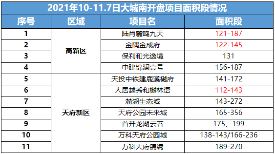 再看10-11月7日成都主城5区+高新+天府新区项目面积数据,这个时间段内,主城5区开盘的17个项目中,设有130㎡以下面积段的项目多达11个,占比近65%。