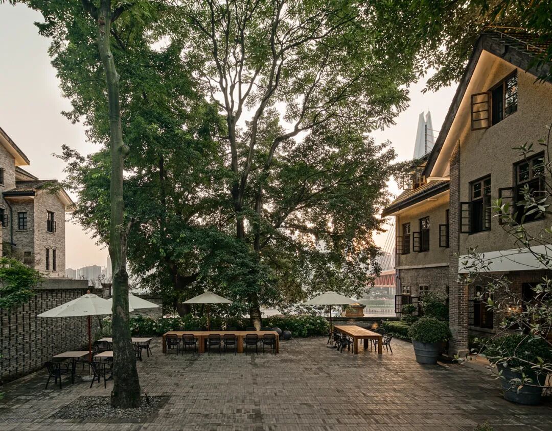 重庆南滨路龙门浩老街的最高点,设计师团队利用民国时期新华信托银行旧址及美国使馆武官别墅旧址两栋区级文保建筑和按旧图纸,使用旧砖瓦修建的三层建筑龙门浩9号楼,设计了“既下山”度假酒店品牌的首间城市酒店作品----既下山・重庆。设计师紧紧抓住“都市”的概念,用“空间折叠”的方式,让我们在短短的时空内,使都市和自然平衡。