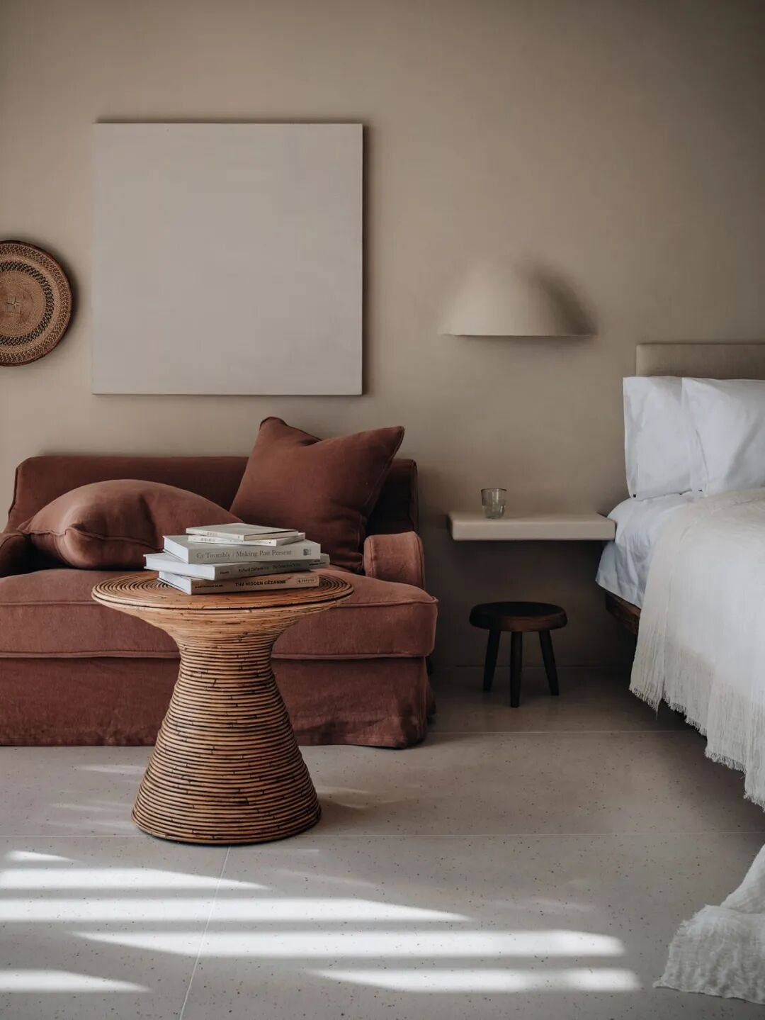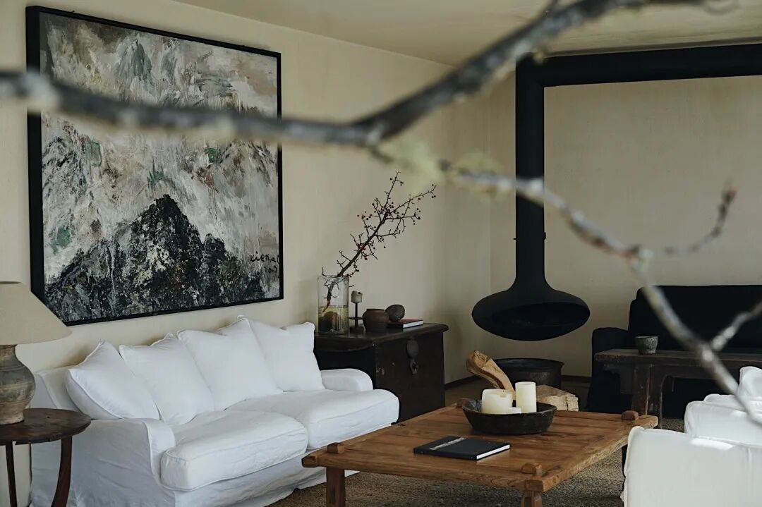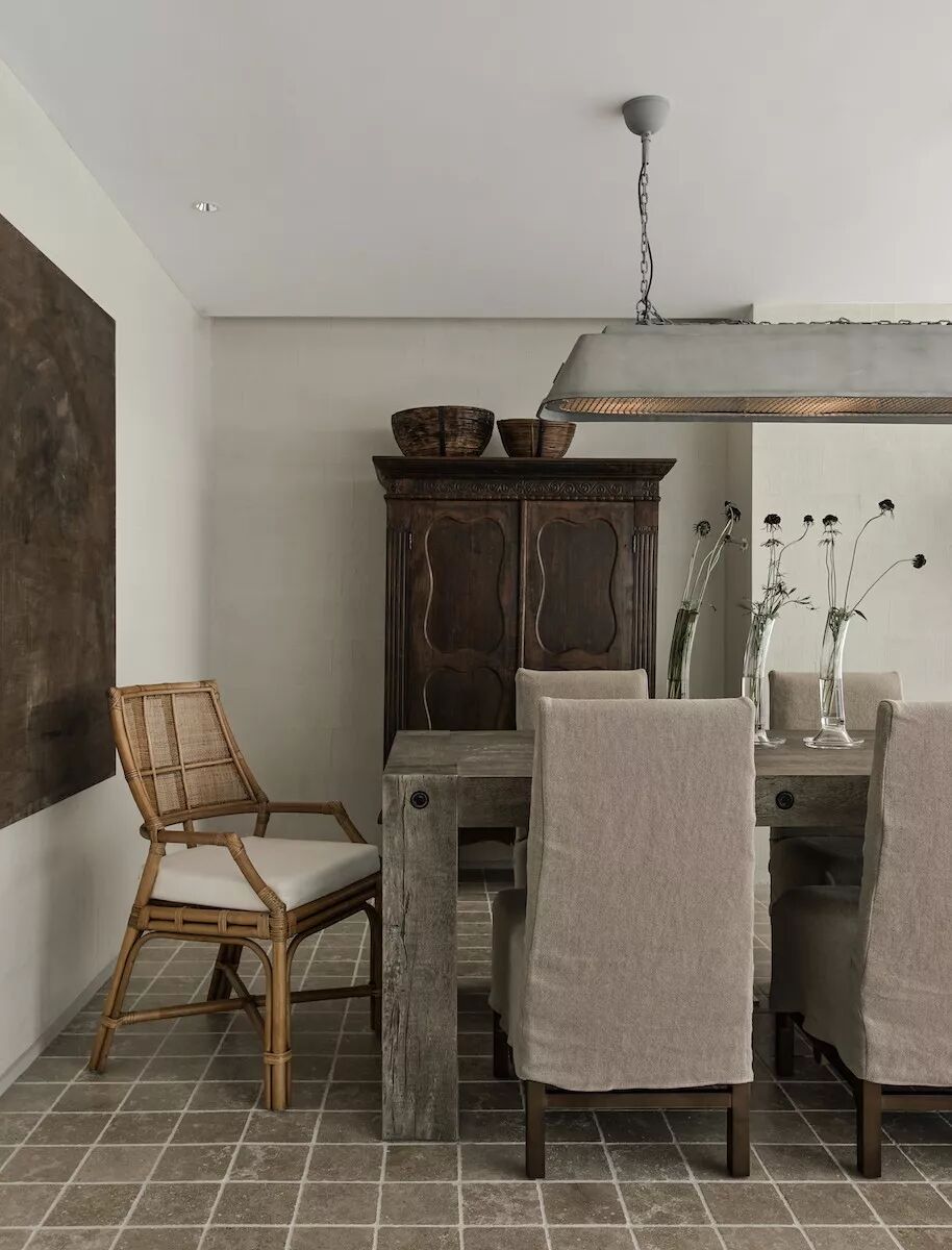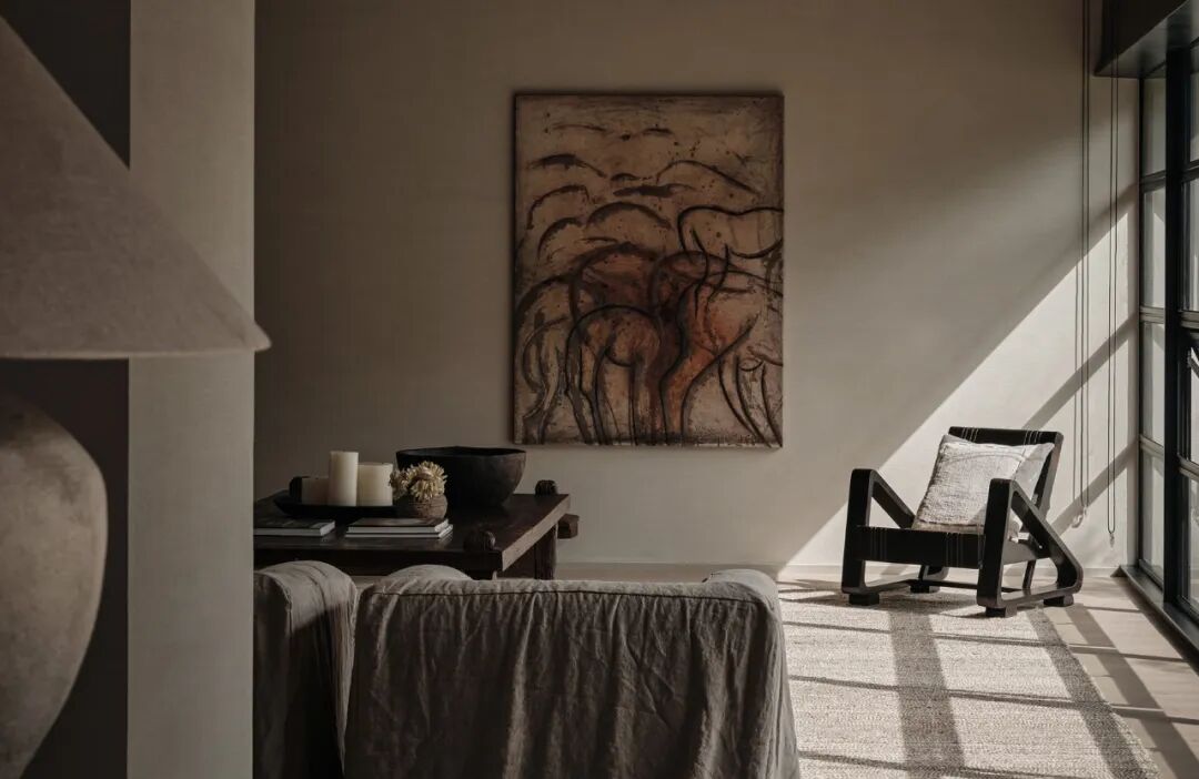 室内家具及收藏品,大多择选自壹集。古而承新,皆是有时间感的物品:天然亚麻沙发、温润的木质单椅及孤品茶几、来自于出身在非洲的抽象派艺术家Kader.Boly的画作...... 尤爱民间的艺术,它们带有某种诙谐趣味,充满原始的生命力,那是设计师很难制作出的朴实与自在。
