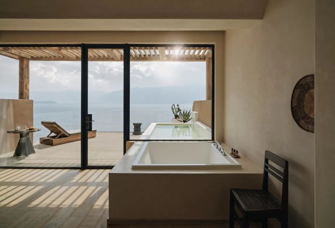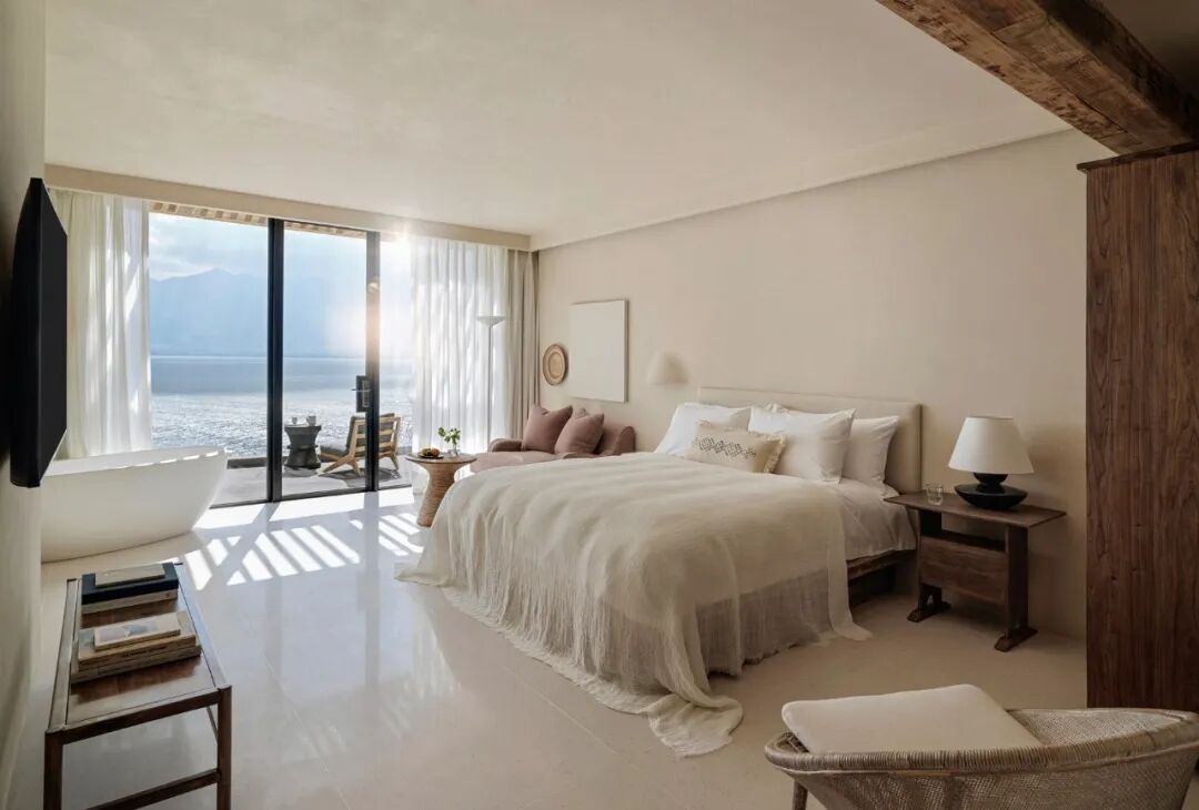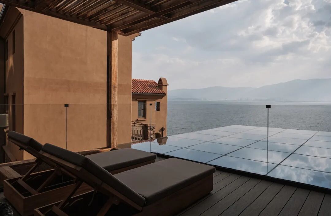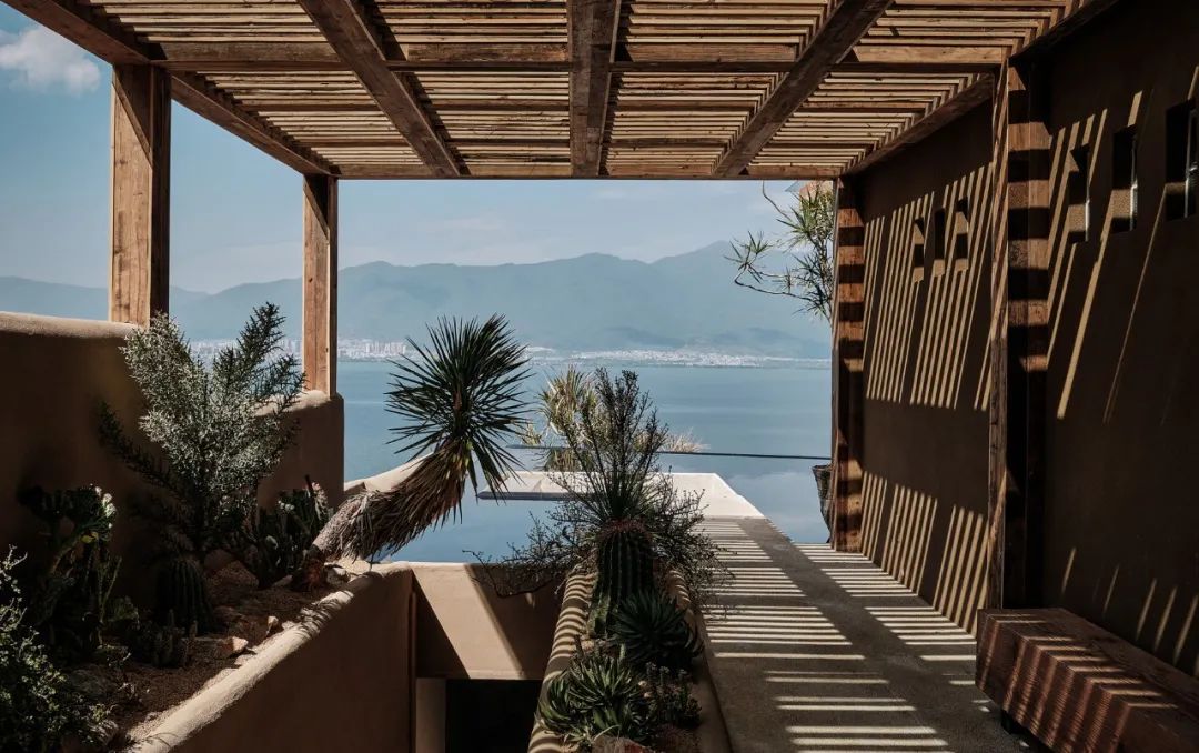 小而美悬崖海景酒店,位于海东山腰的一处别墅群里,倚洱海而立,与苍山、古城隔海相望,悬崖之畔,视野开阔独特,比起双廊多了份静谧。海是景,空间亦如是。大面积使用玻璃砖,透光不透影,行走的每一步都置身风景。而拨开帘幕那瞬,即可揽拥海天之色。在这所房子里,时间与空间共情,缔造出慵懒、温柔、舒适自在的境域。正如谢柯所希望的那样,每个设计都像在环境中长出来的花朵,“带着露珠和人的体温”。