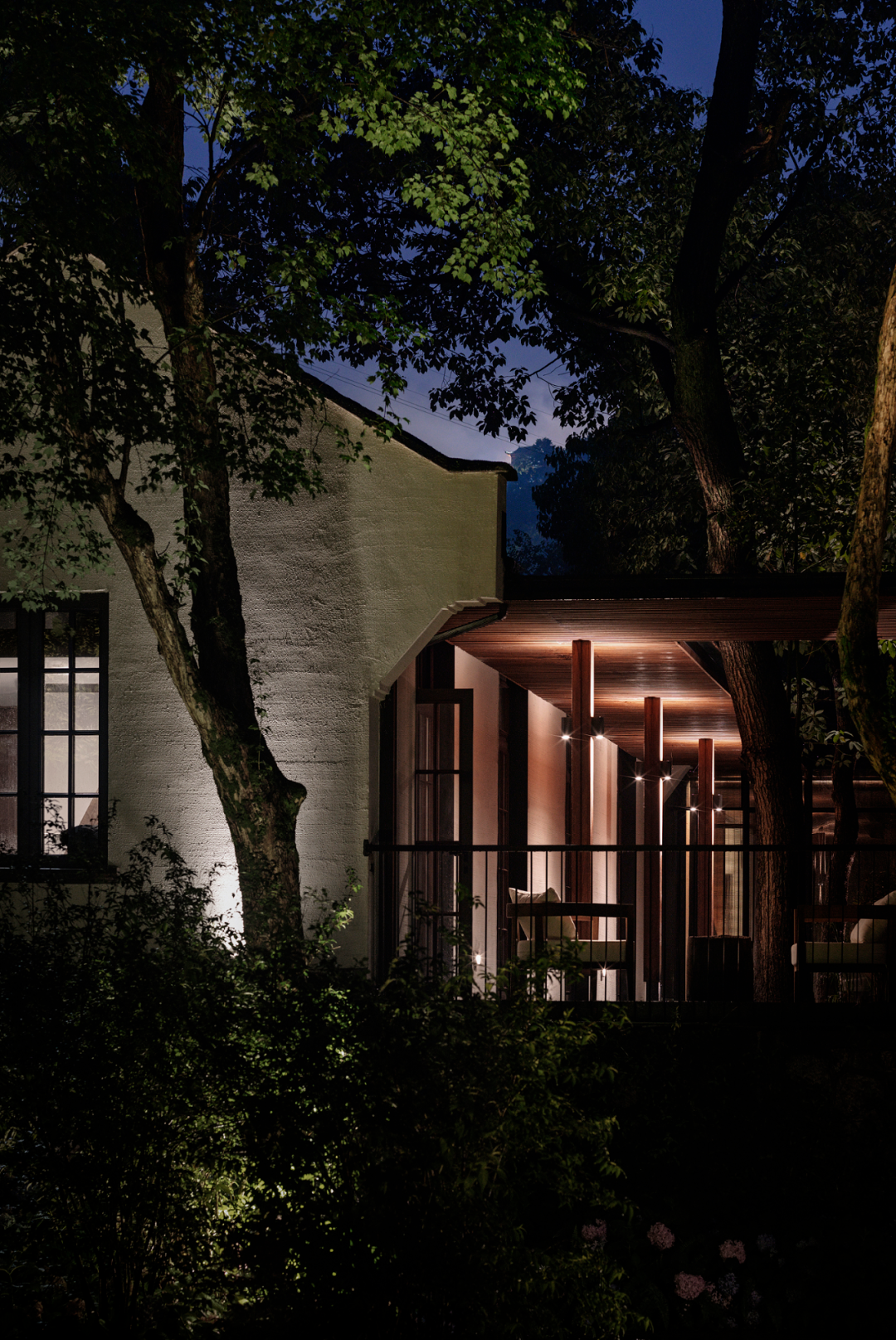 在褐色与深灰色的地面石材映衬下,古旧、具有中西合璧趣味的深色家具,散发出深邃的光芒,美国使馆武官别墅后院的私家露天泳池变成一汪水塘映着天光,这里绿植充盈,成为可休憩的隐秘花园。