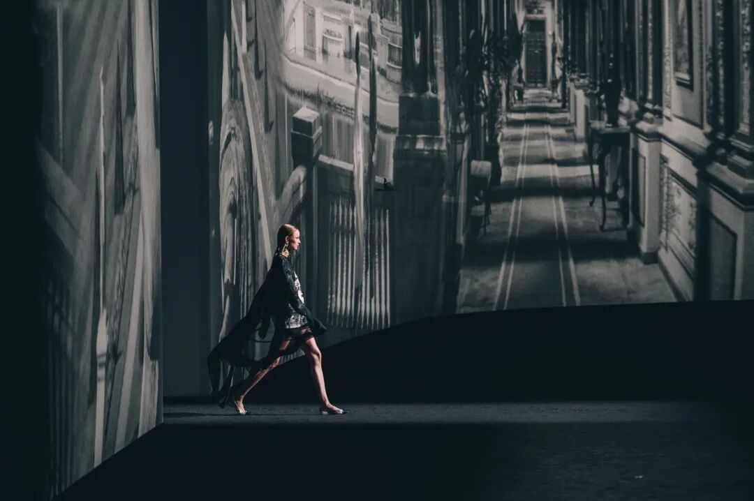 从大秀宣传影片开始,这季就让人沉浸在极富电影感的氛围中,轻盈优雅的时装加上360°环幕影像秀场,构思出穿越时空的迷人图景,以Rianne van Rompaey开场,Vivienne Rohner闭秀。