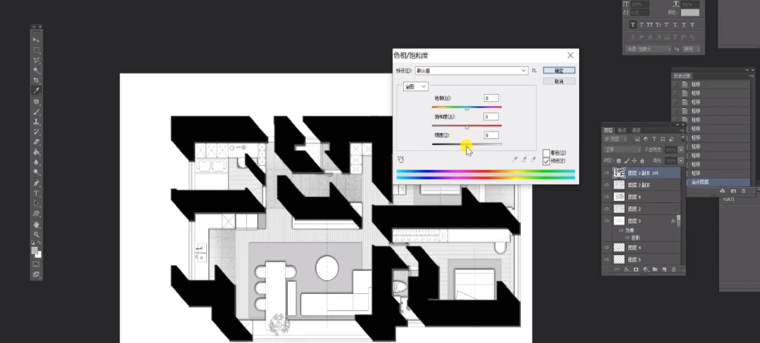 课件中纹理拖入,色相饱和度工具去色,调整不透明度,矩形选框工具选择平面图的范围框选并调整羽化值delete删除选区。