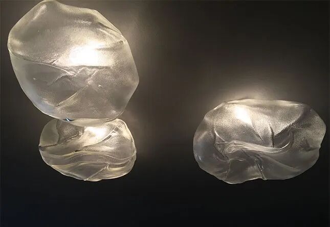 73壁灯是通过将液态玻璃吹入折叠且高度耐热的陶瓷织物容器中形成的。由此产生的形状具有和之物纹理相似,当它冷却时变得永久和刚性。