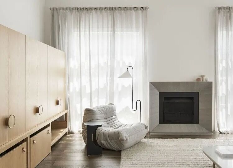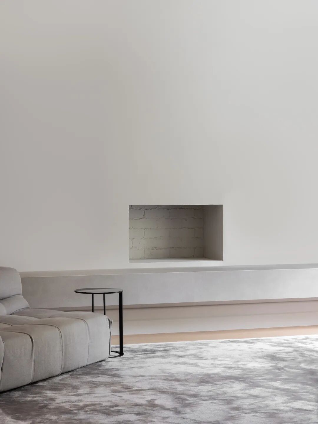 B&B Italia Tufty-Too 沙发配有现代修复的砖壁炉和客厅中的定制混凝土融为一体,从视觉上增大了客厅的空间。