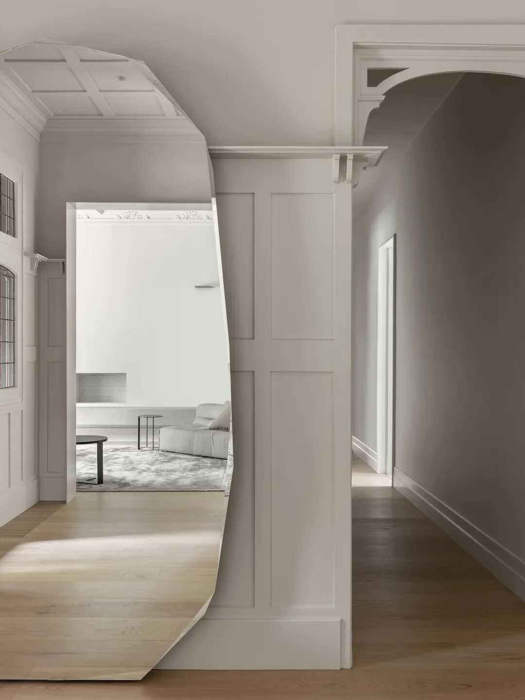 自然光通过新的玻璃门和客厅的宽敞开口射入入口大厅。入口处摆放着几何镜子。设计师Carr 重新配置了住宅的内部旅程,拉直了走廊,以创造一个从东到西的干净视线。