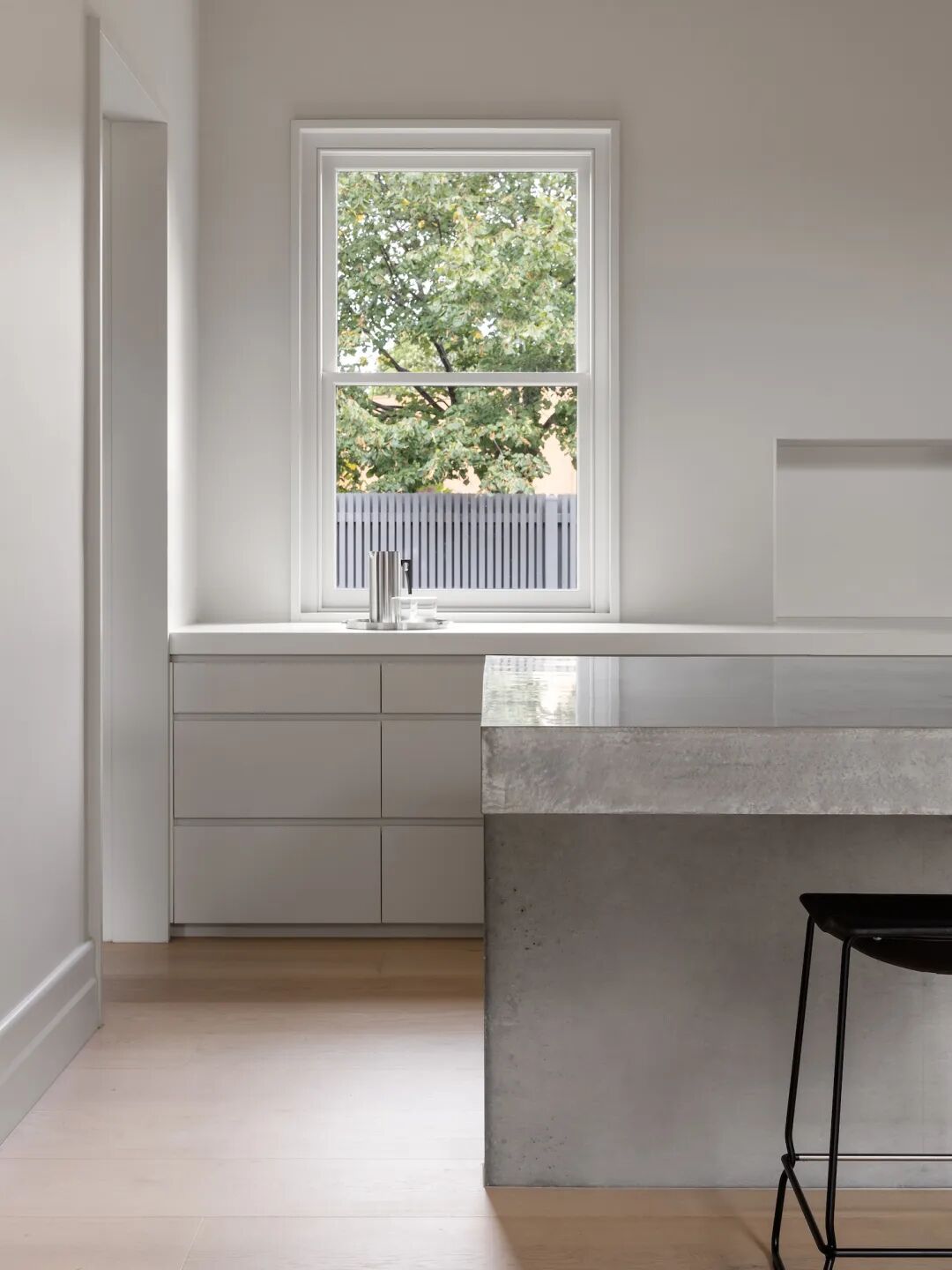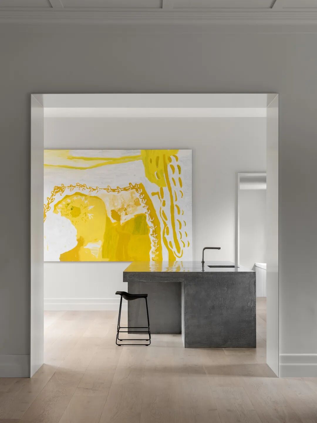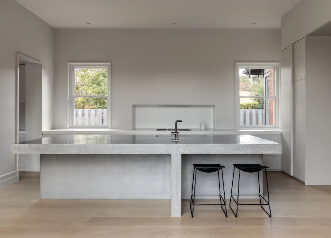 厨房一直是家庭生活的焦点,设有一个整体的混凝土岛台,由 Keenan Harris 的 Concrete制造。设计为不对称的悬臂式底座,为厨房造型增添了一抹亮。(挂画是来自 Lily Hardgraves Nungarrayi的作品)