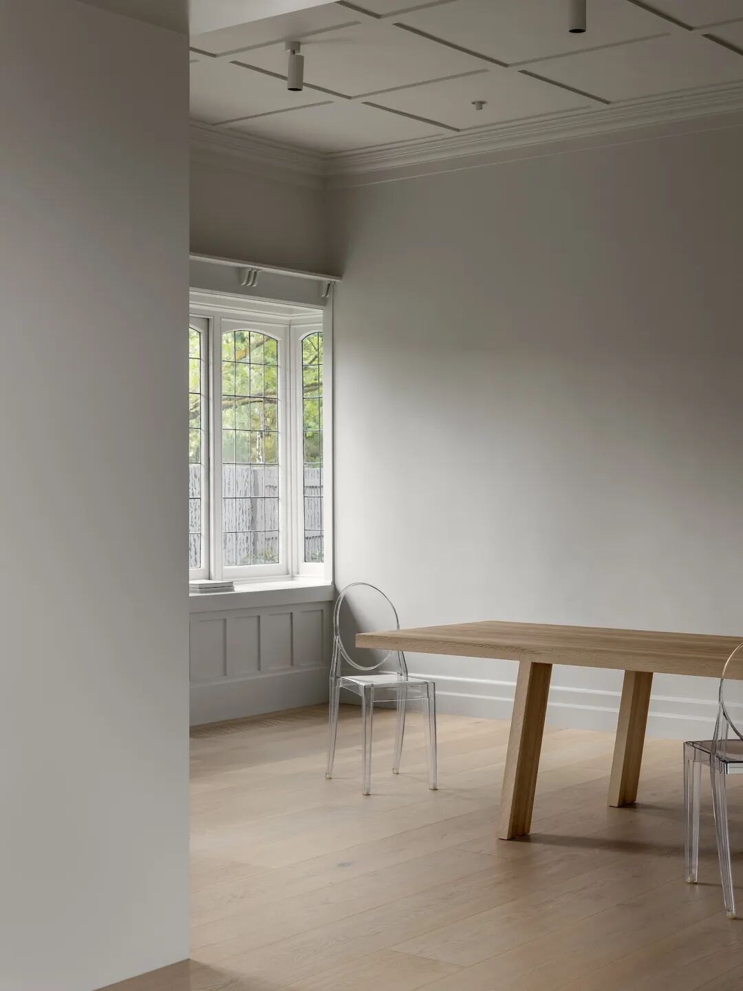 从餐厅空间中可以看出,铅灯凸窗和网格天花板提供了精致的氛围,是设计灵感和身份的起点。Kartell Louis Ghost 的椅子和原木餐桌组合在一起,别具一格。