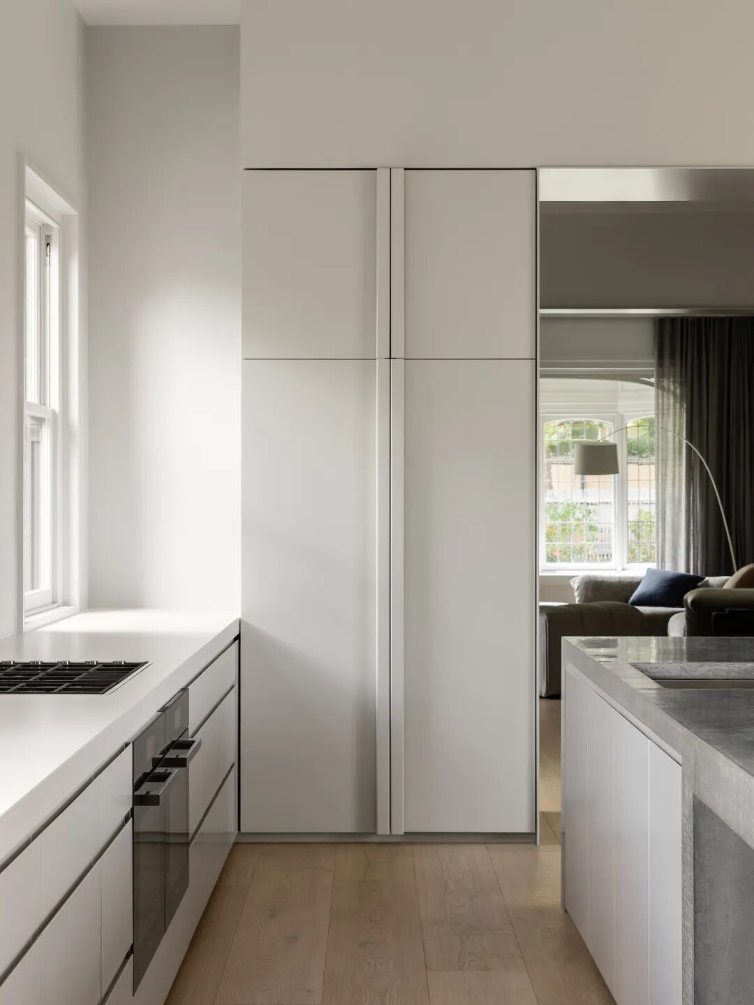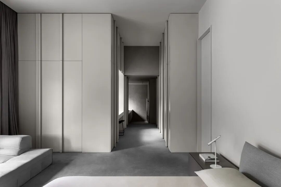 厨房里的定制设计一直延伸到主卧室的步入式衣橱。主卧以简单的灰调搭配白色的家具,当您穿过家时,给人一种平静又连贯的感觉。