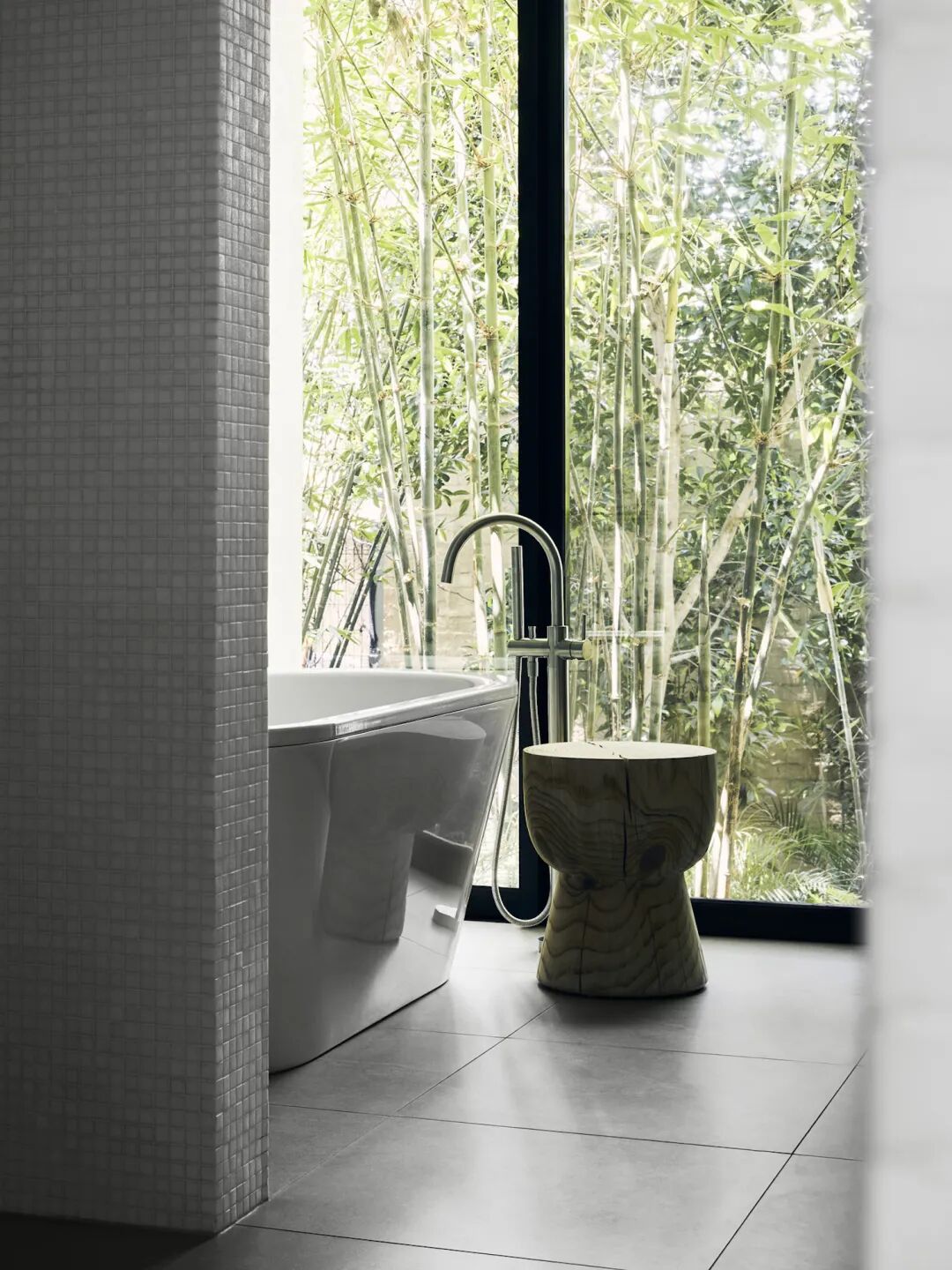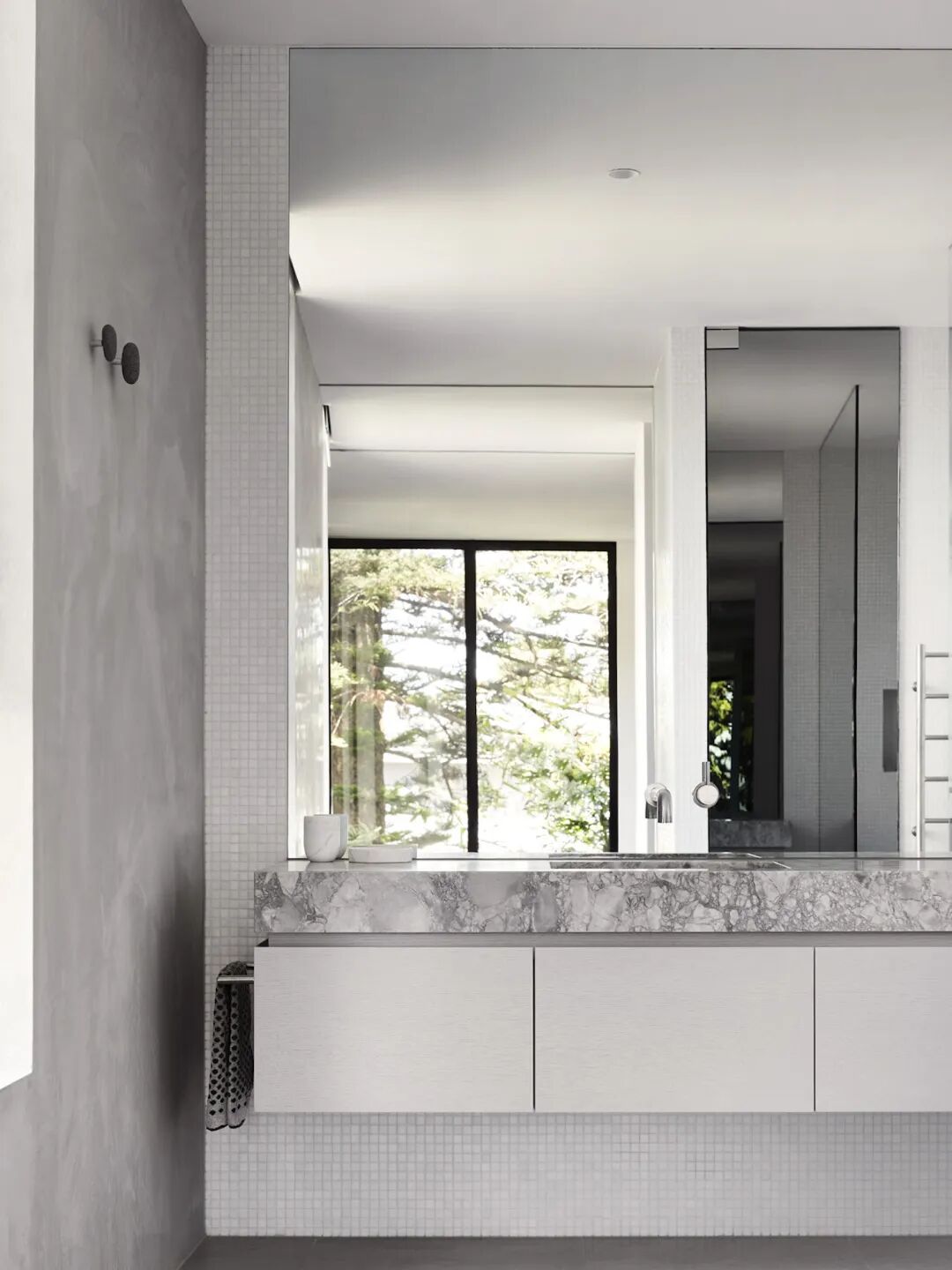 浴室中摆放了客厅同款边桌,马赛克和大理石的使用并没有破坏这个混凝土空间的氛围,反而增添了一份精致感。