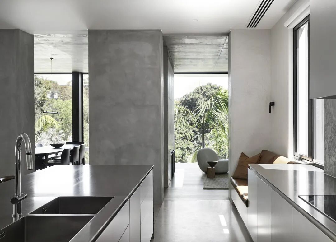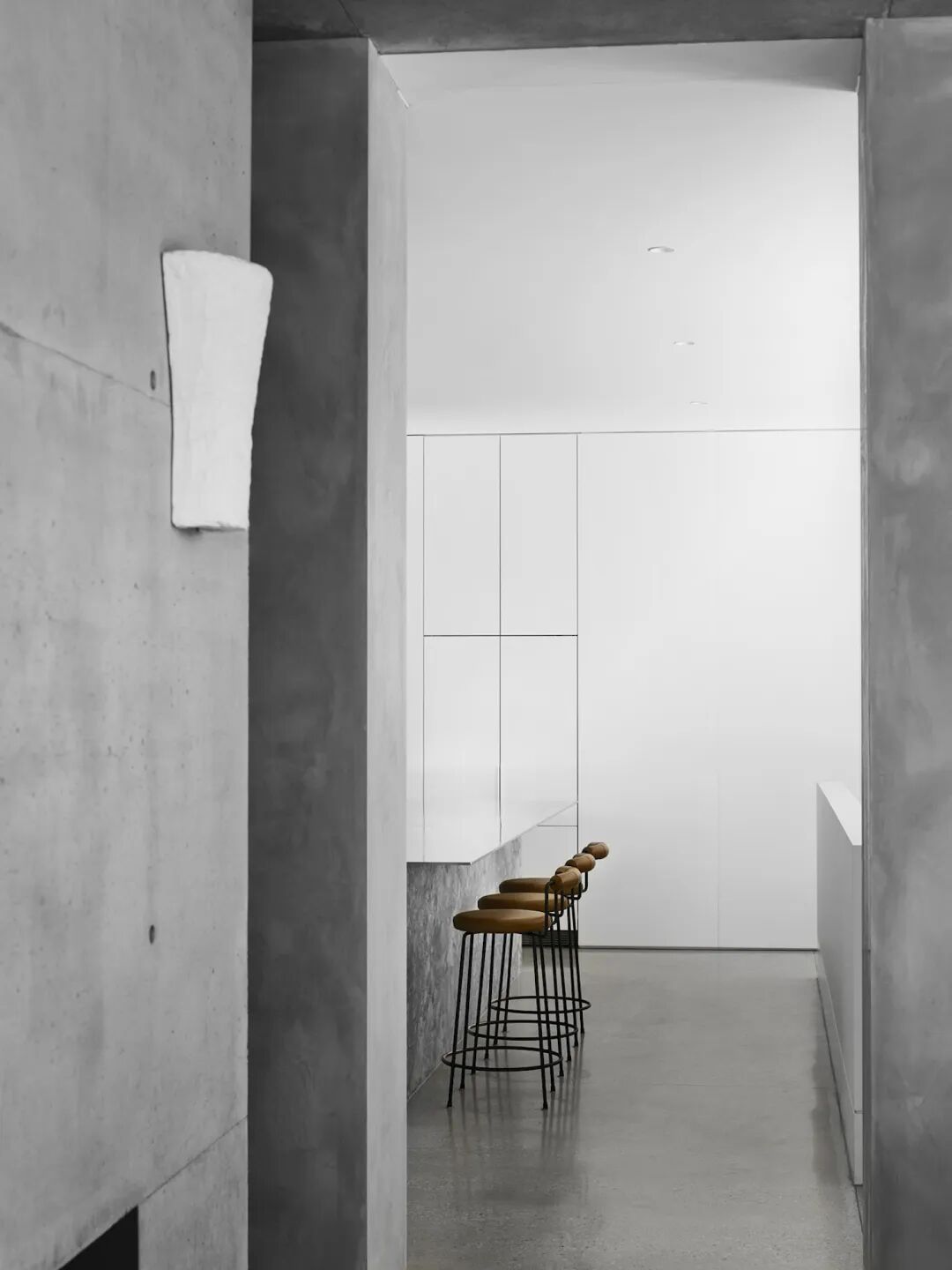 Moroso Bloomy边桌位于定制皮革卡座旁。棕褐色皮革餐凳与同款色的定制卡座呼应,共同为这个混凝土打造的用餐区注入了活力。