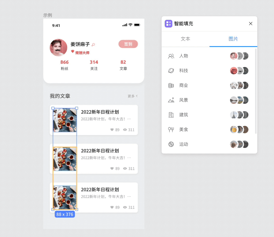 「智能填充」插件可以一键批量填充不同主题的无版权图片;接入的「Humaaans 人物插画」插件,也提供了大量可免费商用的插画素材。