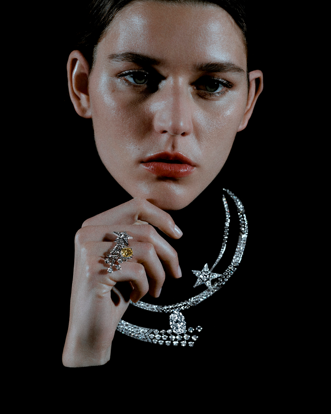 系列中包括一件 Allure Céleste项链,日、月、星光同时闪耀,视觉中心是一颗重达55.55克拉的椭圆形蓝宝石,契合香奈儿女士的幸运数字5。