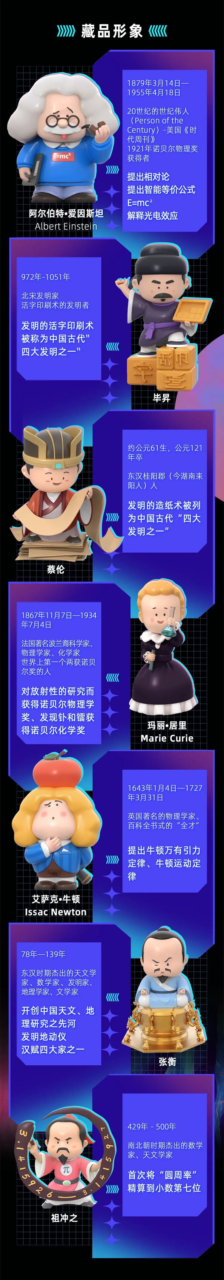 该系列首期选择了历史上耳熟能详的七位科学家,牛顿、爱因斯坦、居里夫人、毕昇、蔡伦、祖冲之、张衡,并创作了对应的3D科学家形象数字藏品,每个形象仅发售2000份,共计14000份。