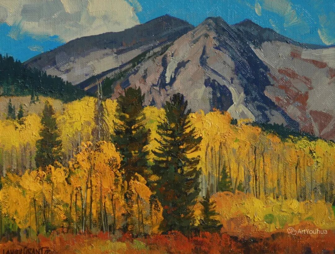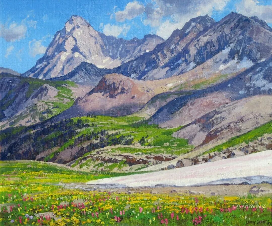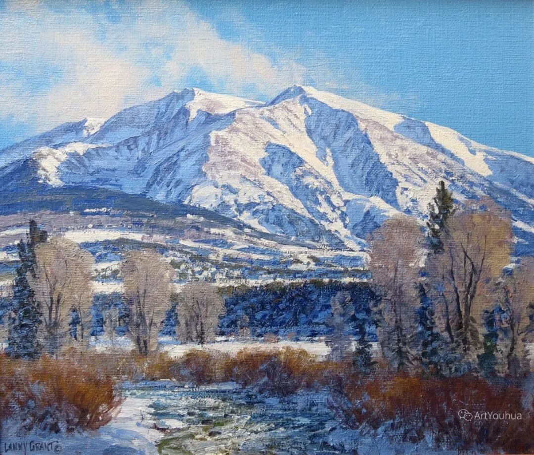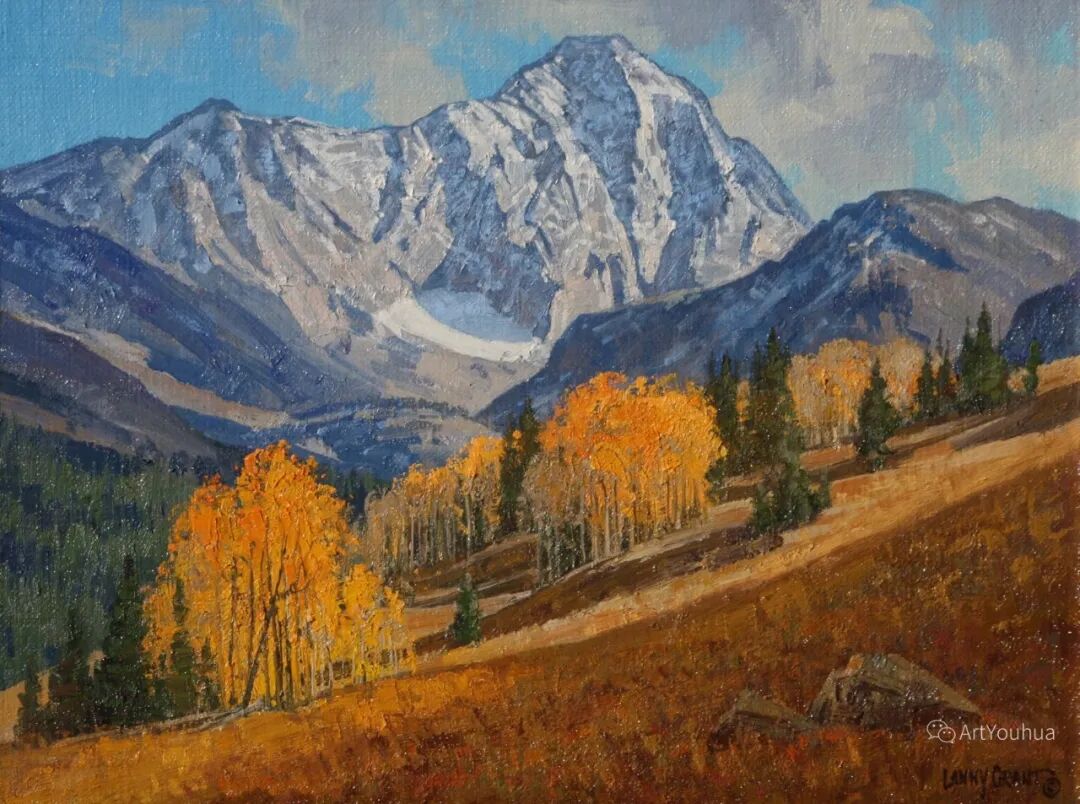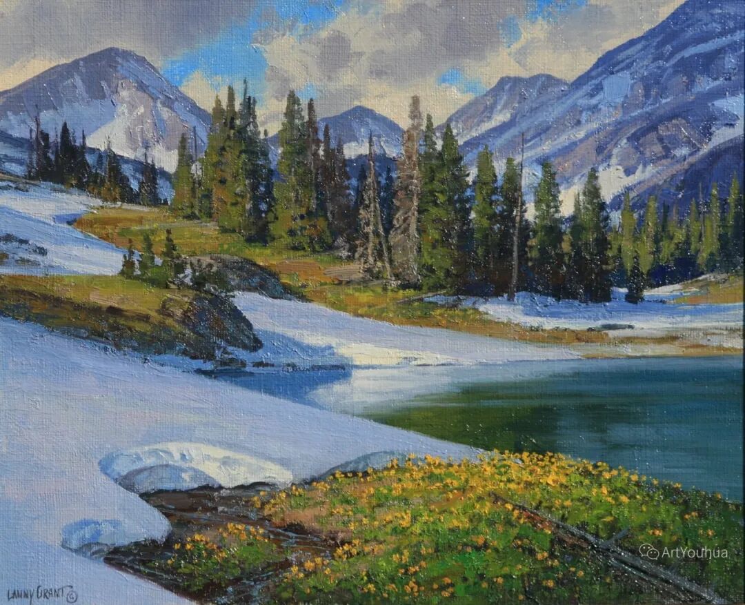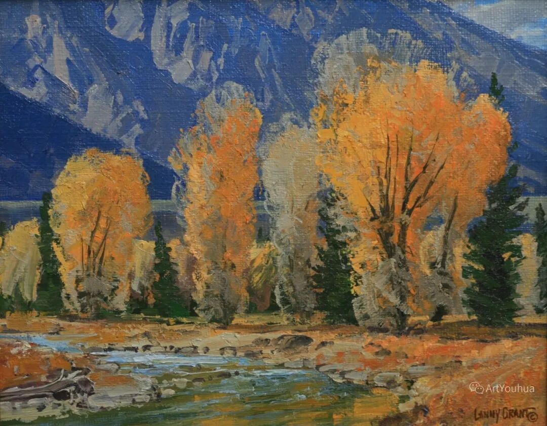 兰尼·格兰特(Lanny Grant,1953-),美国画家。他居住在科罗拉多州西坡小镇Silt附近--离他在父亲的桃子谷牧场长大的地方不远。家庭露营和钓鱼旅行变成了写生旅行,这是早期的艺术努力,因为兰尼对西部科罗拉多州的高地产生了热爱。大部分是自学成才,他在10岁时开始画油画,并通过专注的工作和实践发展成为一名优秀的艺术家。1965年,兰尼遇到了新墨西哥州的艺术家本·特纳,特纳画山地风景的能力给他留下了深刻印象。高中毕业后,格兰特于1971-1972年在科罗拉多州阿拉莫萨的亚当斯州立学院学习,在那里他获得了艺术史的知识并学习了生活绘画。