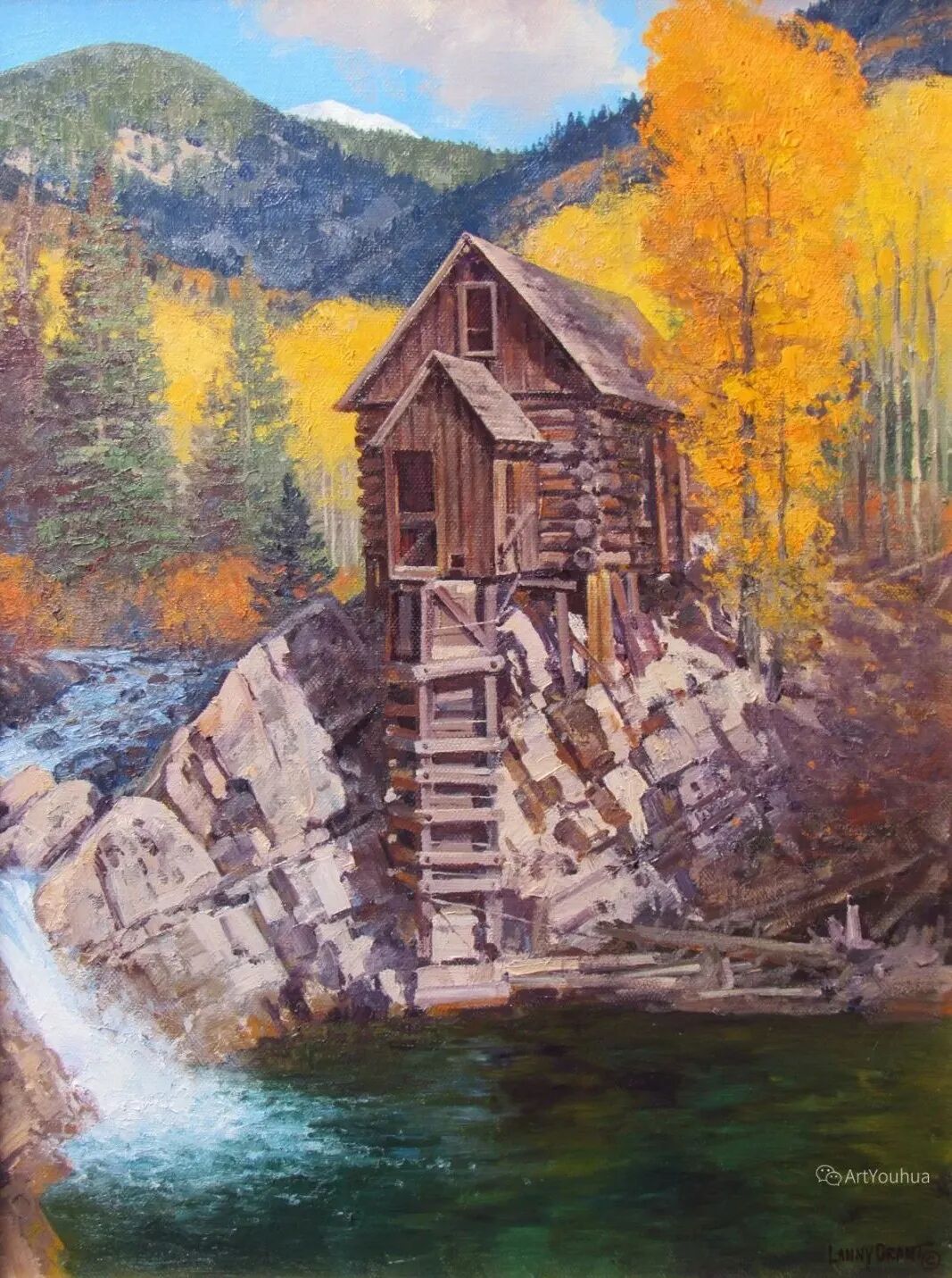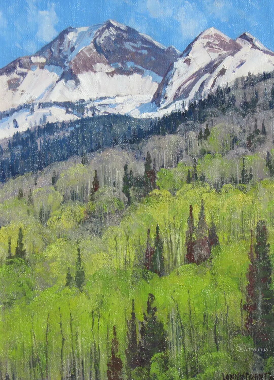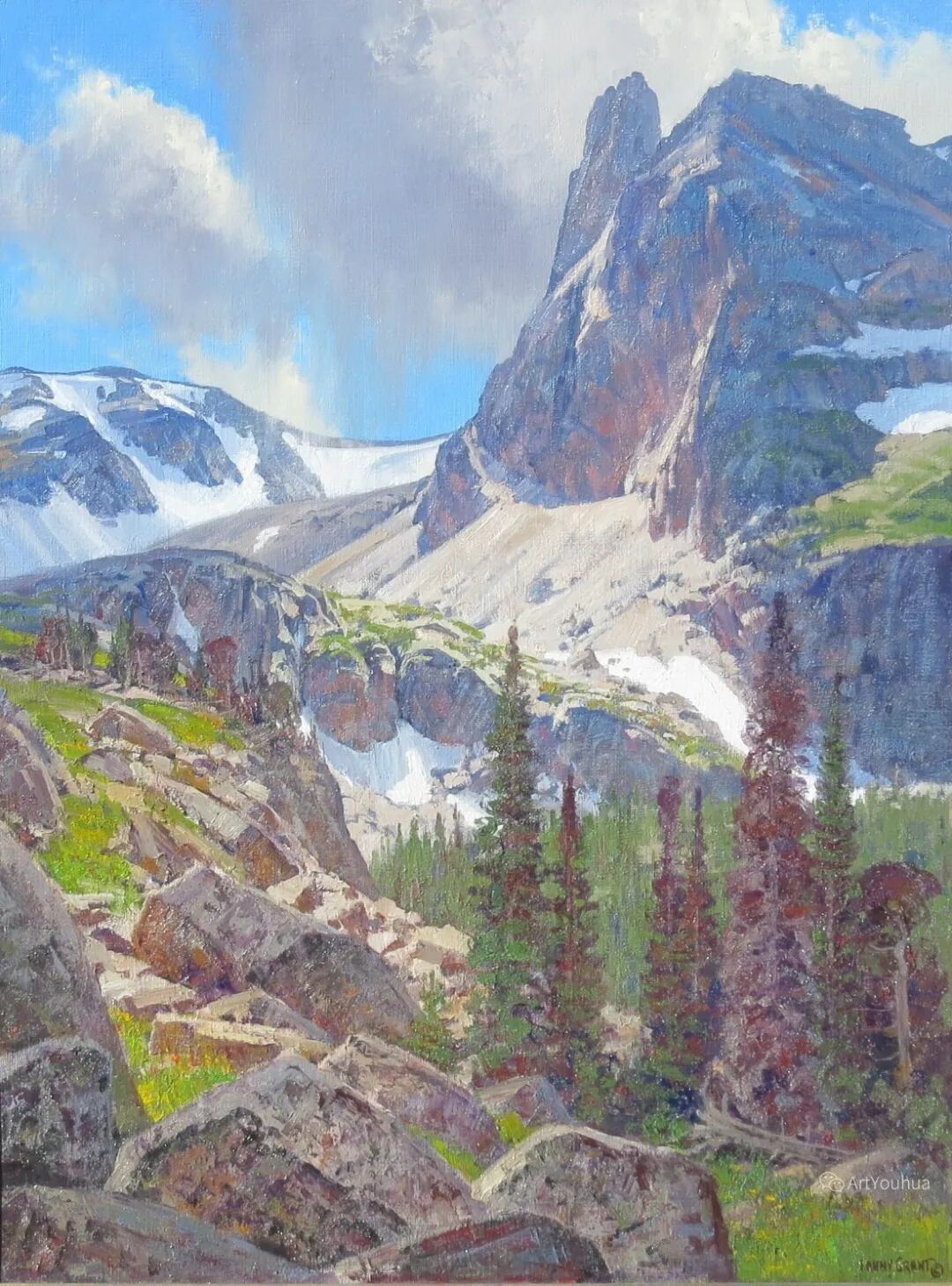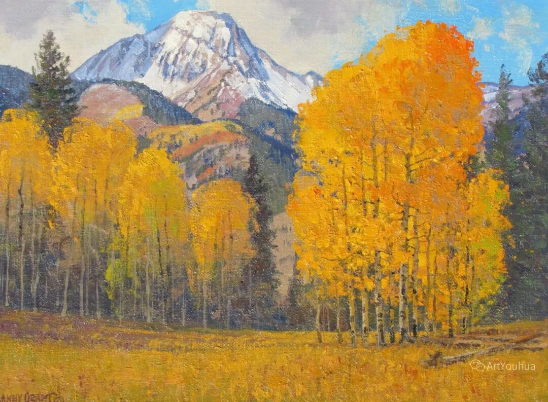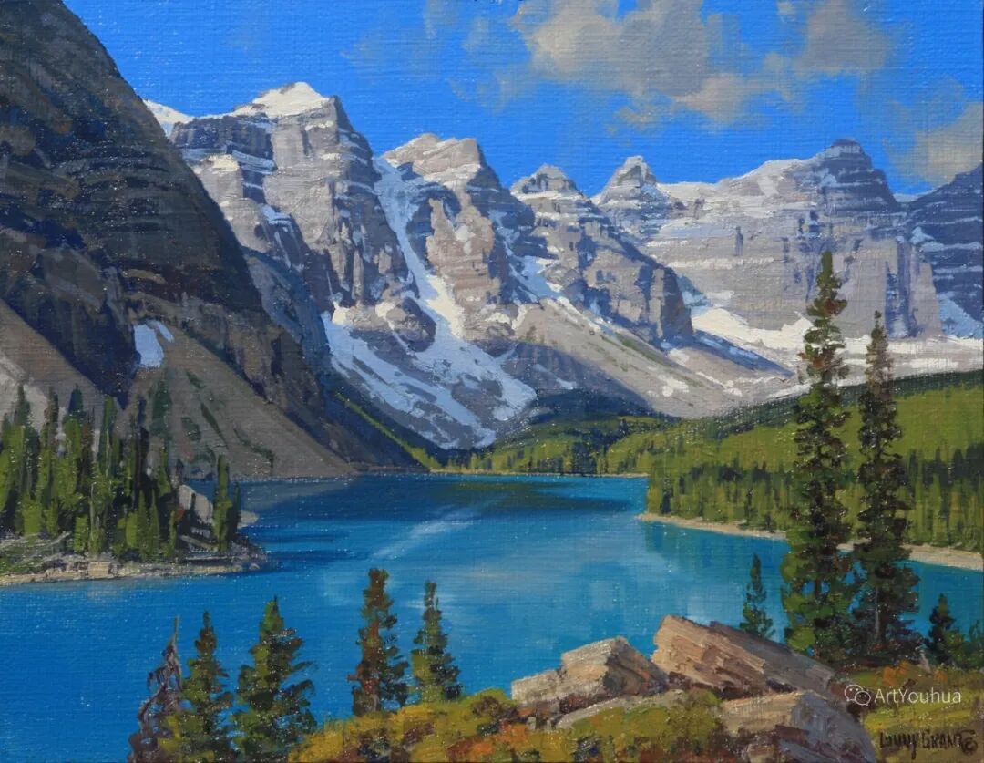 兰尼·格兰特(Lanny Grant,1953-),美国画家。他居住在科罗拉多州西坡小镇Silt附近--离他在父亲的桃子谷牧场长大的地方不远。家庭露营和钓鱼旅行变成了写生旅行,这是早期的艺术努力,因为兰尼对西部科罗拉多州的高地产生了热爱。大部分是自学成才,他在10岁时开始画油画,并通过专注的工作和实践发展成为一名优秀的艺术家。1965年,兰尼遇到了新墨西哥州的艺术家本·特纳,特纳画山地风景的能力给他留下了深刻印象。高中毕业后,格兰特于1971-1972年在科罗拉多州阿拉莫萨的亚当斯州立学院学习,在那里他获得了艺术史的知识并学习了生活绘画。