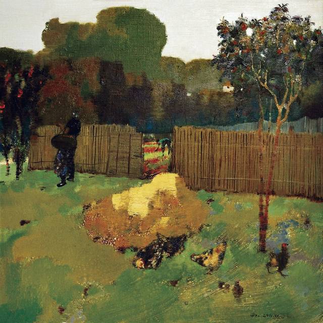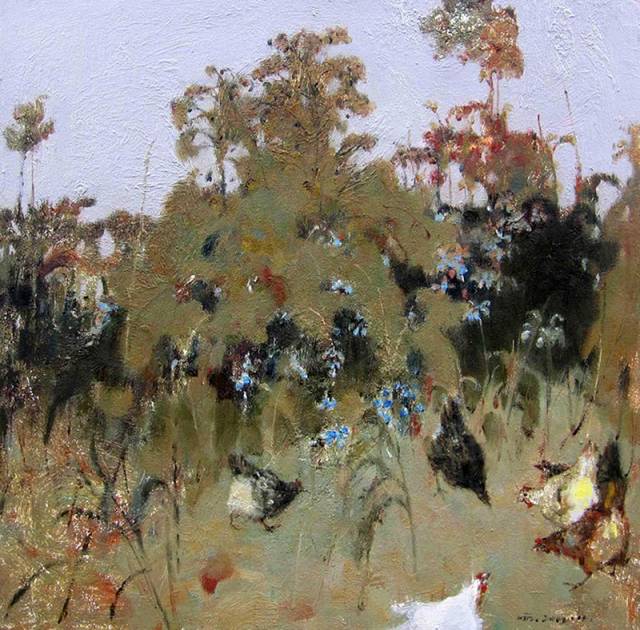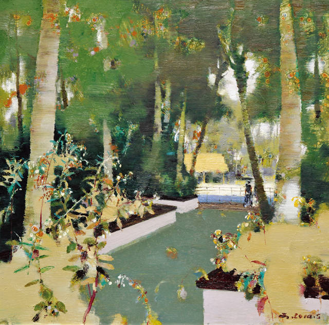 陈和西油画里多是农屋、田地、树林、池塘这些平平常常的景色。可是他却说:“你在这地球上找不到跟我画里一模一样的地方,因为我画的都是理想中的美好景色。”他说他画风景时,不依赖写生,也不依赖照片。我把印象中的那种景色,不同地方美的东西,都凑到一个画面中。