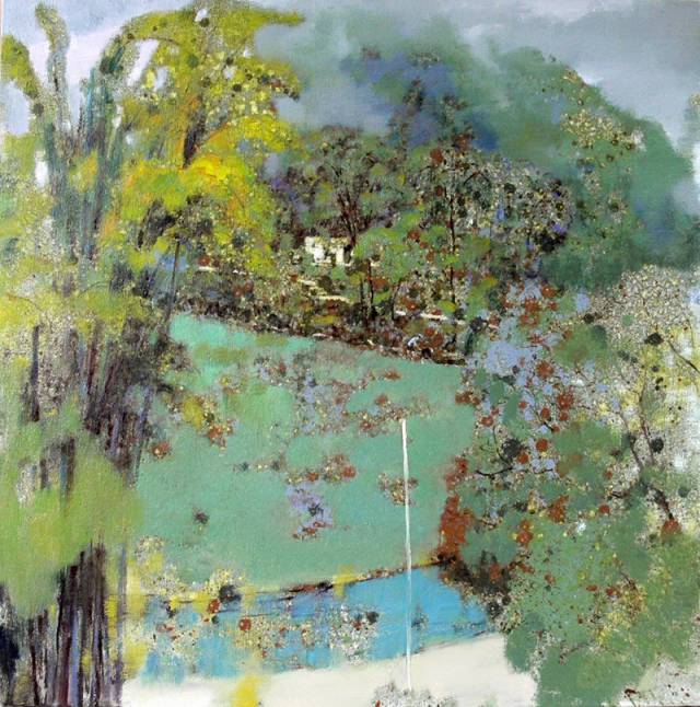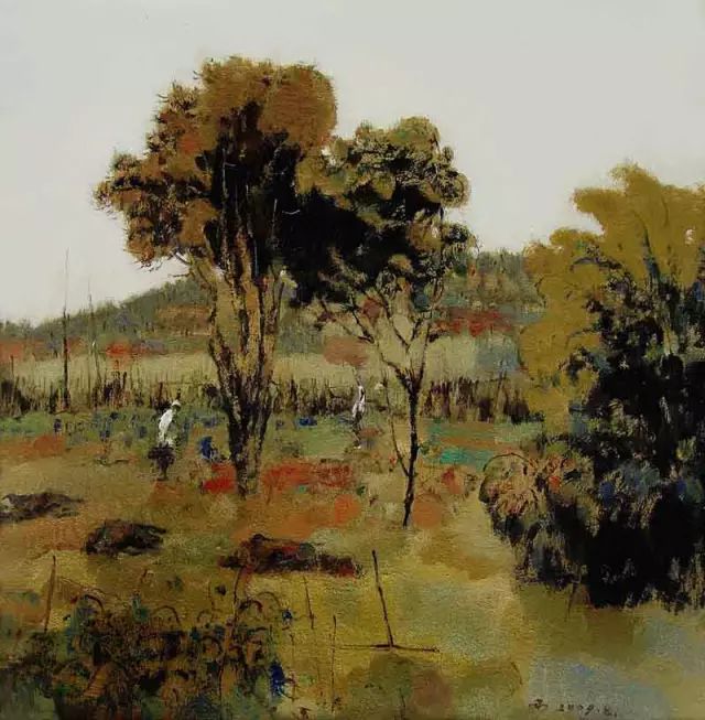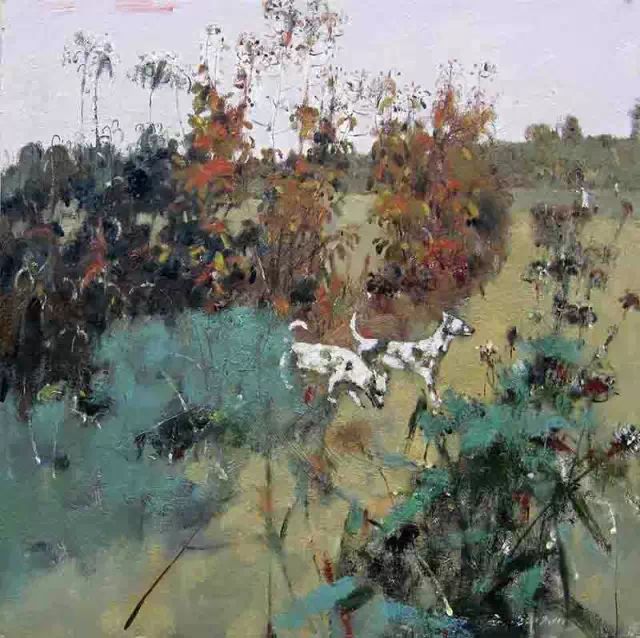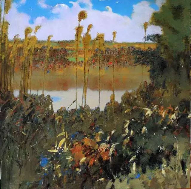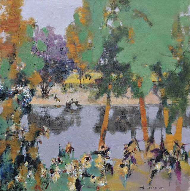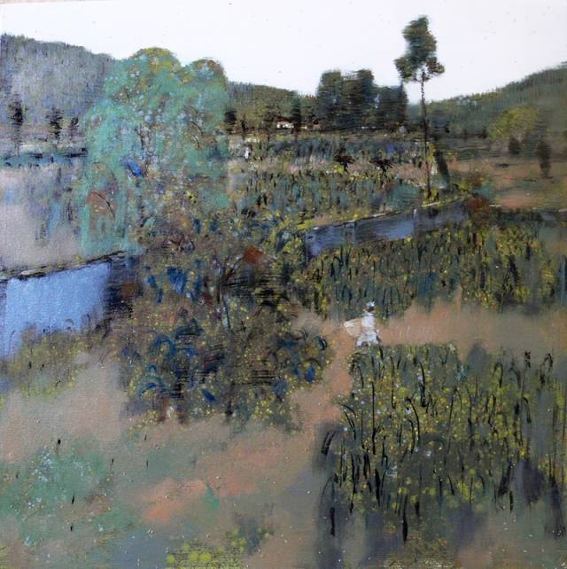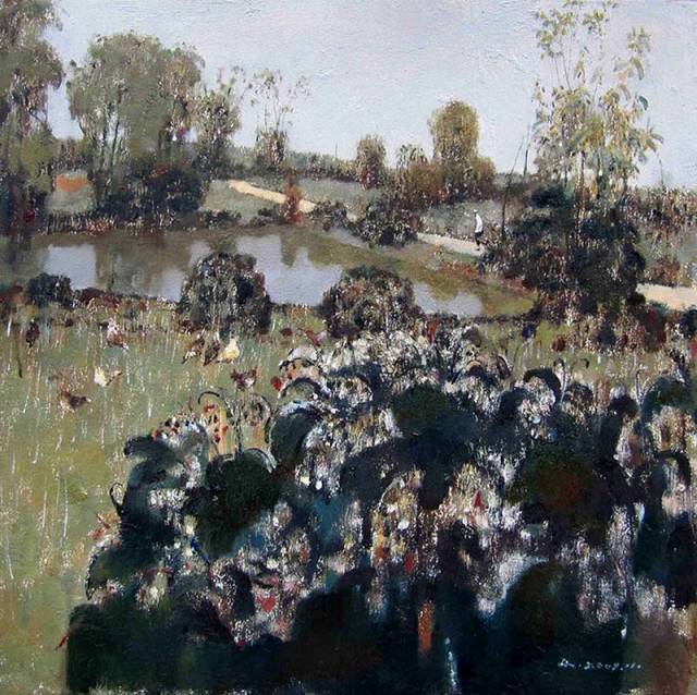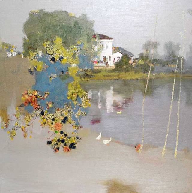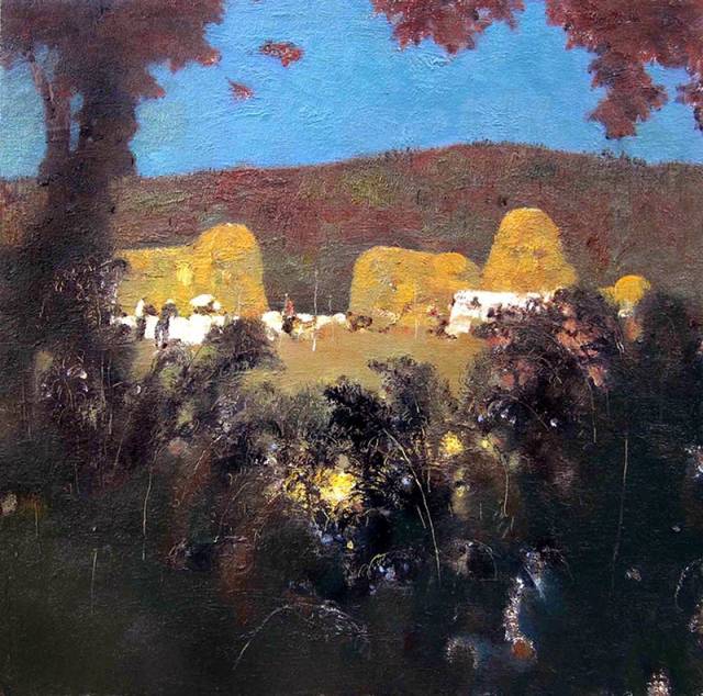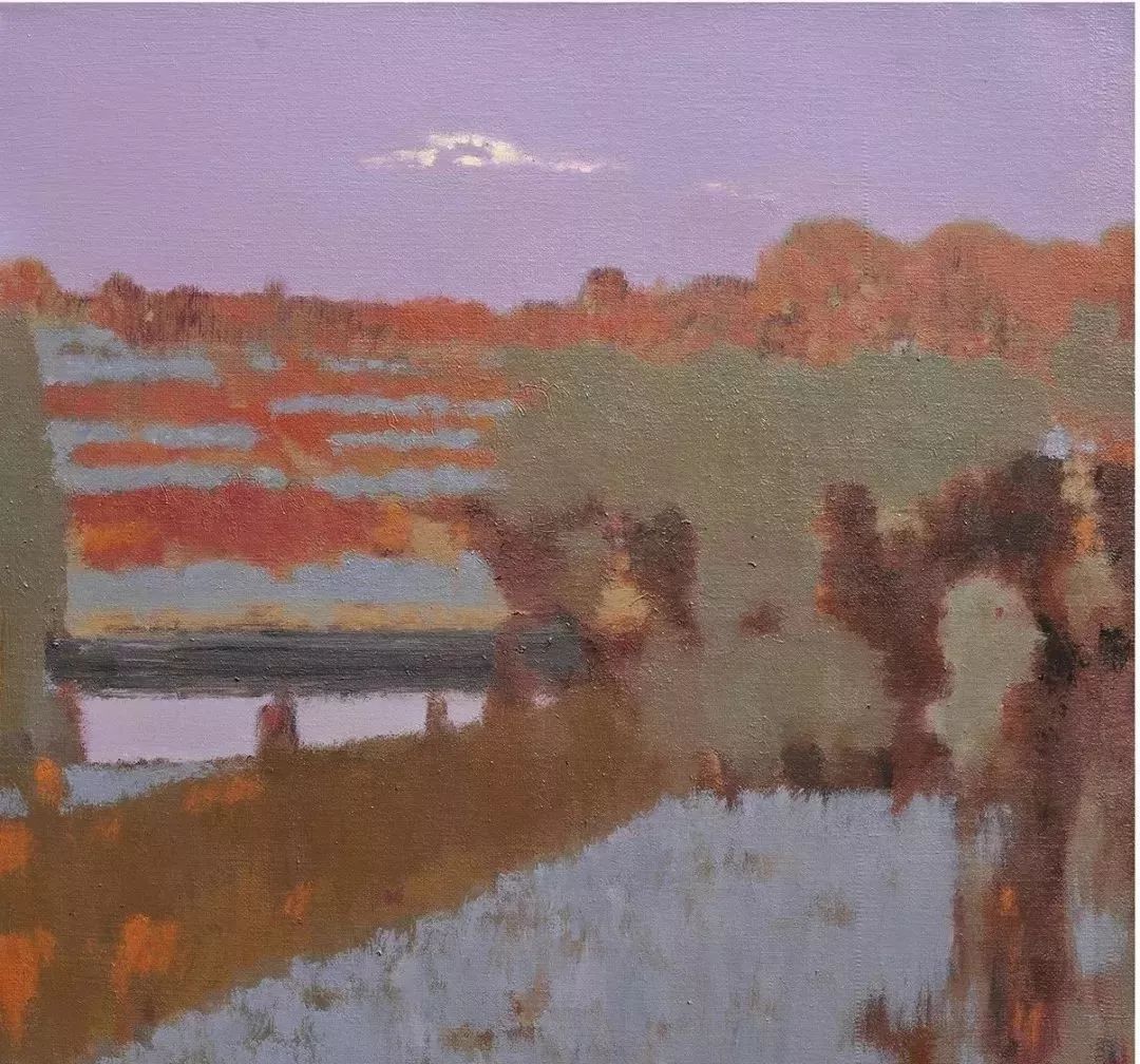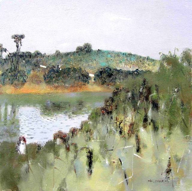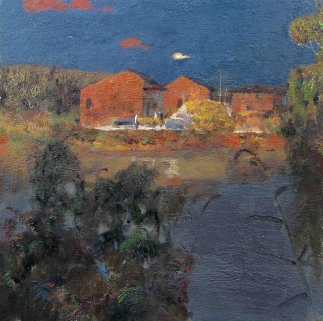 安放自己的角落,一处精神家园。不断放弃、不断求新,不拘泥客观风景的局限,主观创作。把油画色彩技法与中国画的意境构图结合,赋予油画一种中国画的“高深幽远”意境。