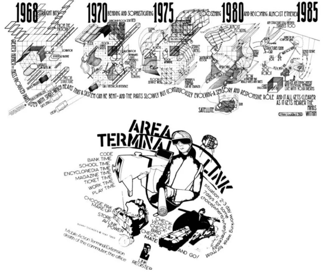 ✸ PETER COOK,家庭变化的序列,1968年。库克将客厅中作为他的起点,客厅由预制小工具组装而成,人的需求被感知/服务单元检测到。1985年, PETER COOK预感到了新时代的来临,进一步修改了LIVING 1990的模型,并植入了移动终端。站到今天的视角上,ARCHIGRAM正确预测了便携式信息终端将改变工作生活方式。