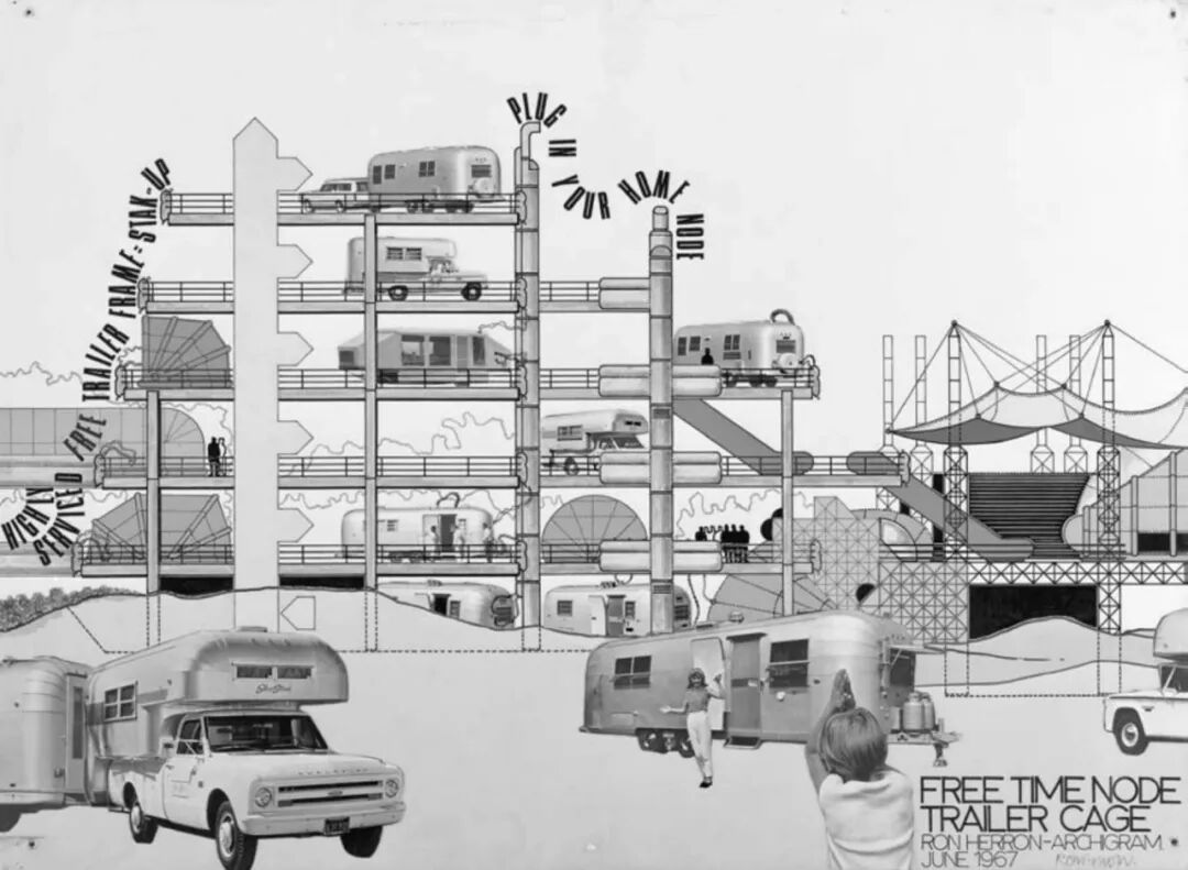 ✸ ARCHIGRAM从美国汽车工业的批量生产流程中汲取灵感,借助战后重建的社会需求和政策支持,他们得到了大量的技术支持,从对轻钢小屋到织物加固的轻型混凝土建造的飞机制造厂房中汲取灵感,ARCHIGRAM在此期间也发展出了INSTANT CITY的思想,关注胶囊屋,旨在以十二分钟一座的速度生产房屋。理所当然的是,大家会设想一种高速生产建筑充斥的同质化街道场景,似乎与情境城市或者现代生活的诉求并不一致,然而,高度的定制化个性化设计反倒在ARCHIGRAM的愿景中成为街道去同质化的驱动力,同质化的反倒是原有的城市建筑。
