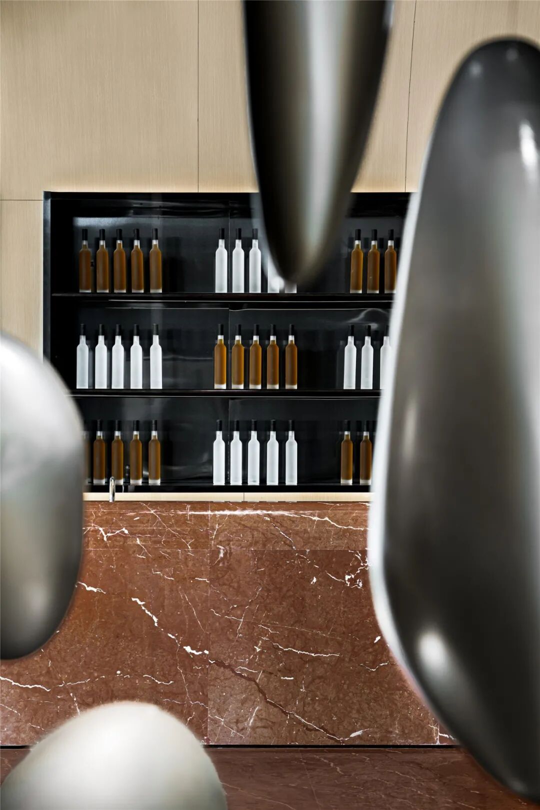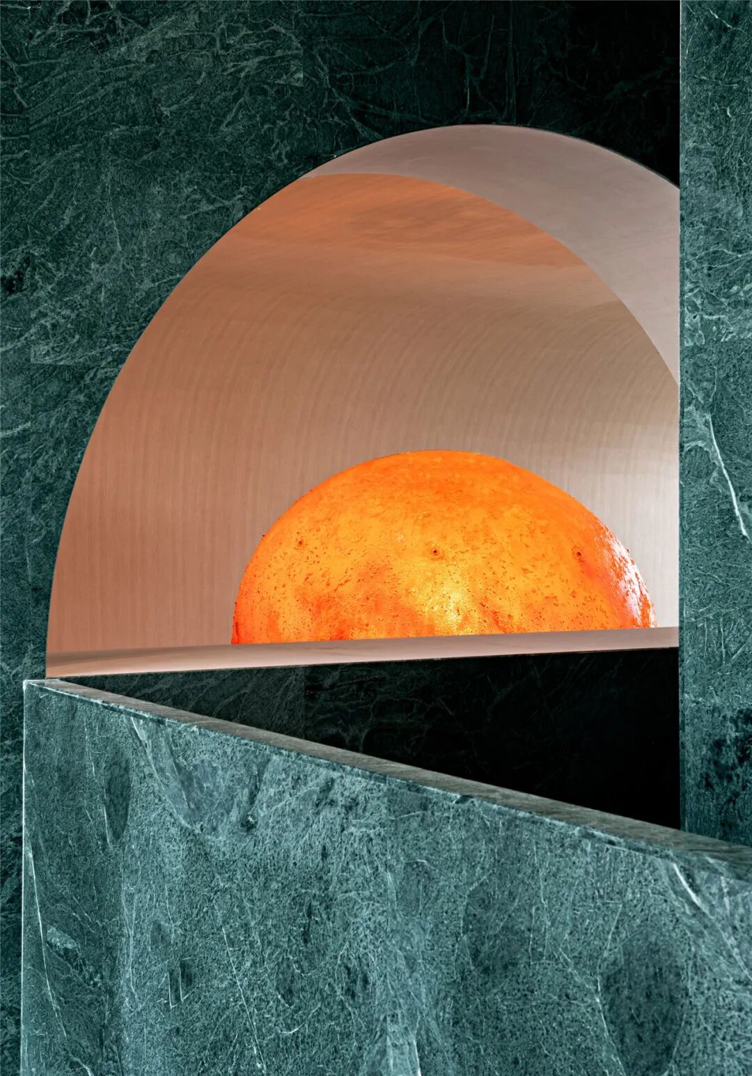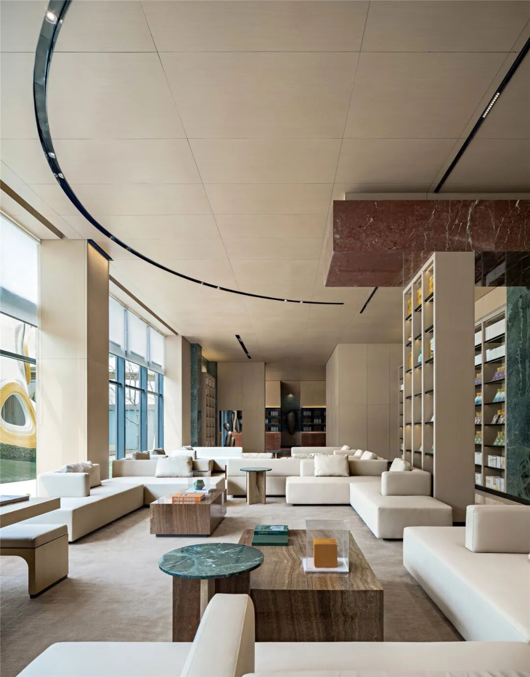大尺寸的弧面造型包裹着初入空间的访客,搭配黑色金属,时而热烈,时而沉静。对称创造了平衡,平衡创造了审美的秩序。