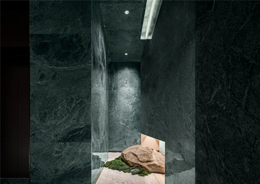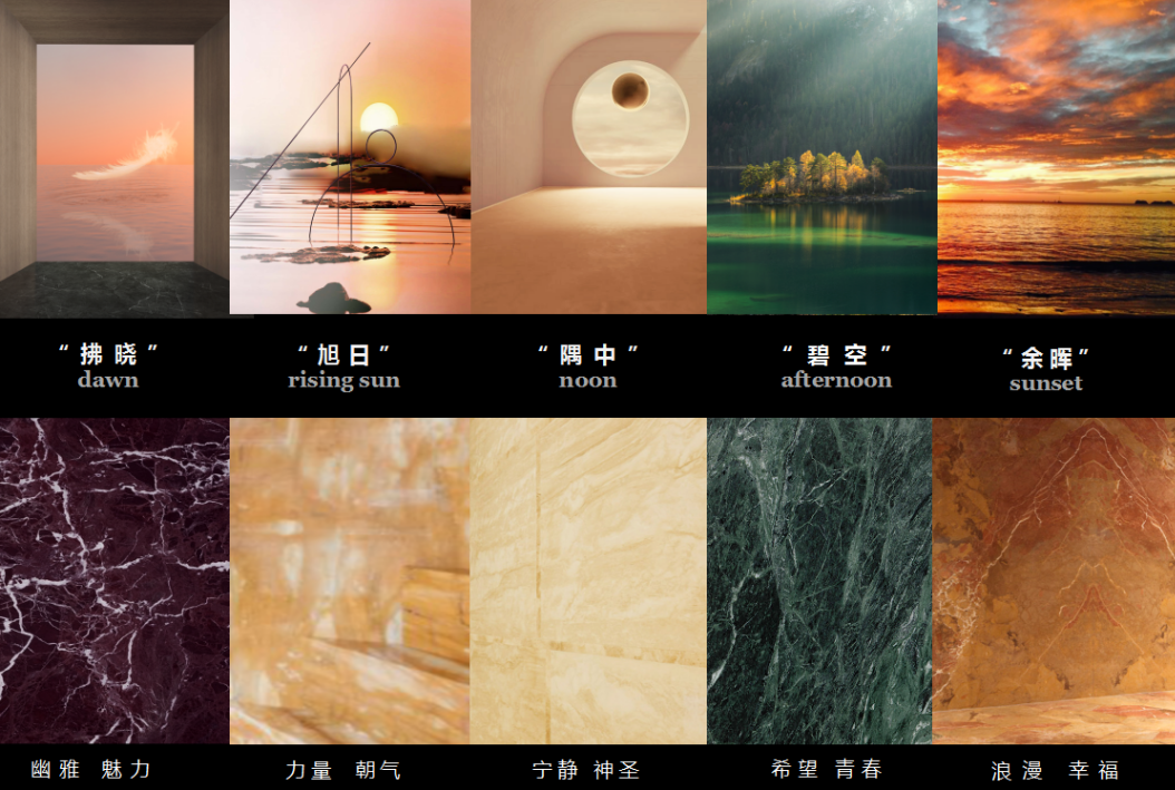 我们想表现一天中的多个自然时段,以自然石材体现大自然的抽象变换,用色彩、肌理去传达源于自然现代生活的情感。让人的行走、时间的流转、空间的变幻,共同创造出一个关于时间与空间的融合,即“何时开始,何时结束”。不断表达对空间、时间、自然、及所有涵盖其中的物质的融合状态。