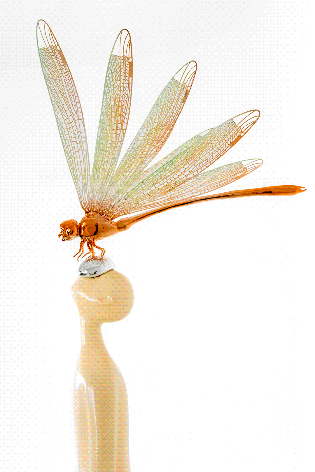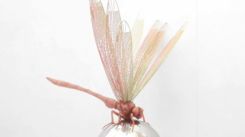 蜻蜒在中国涉语中,有“低飞过道非风即雨”的预知作用。《静谧》通过蜻蜓与水珠的契合形态,呈现出柔美轻盈的景象,诠释了“小荷才露尖尖角,早有蜻蜓立上头”的初夏意境。