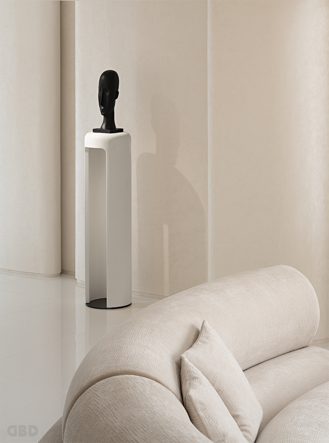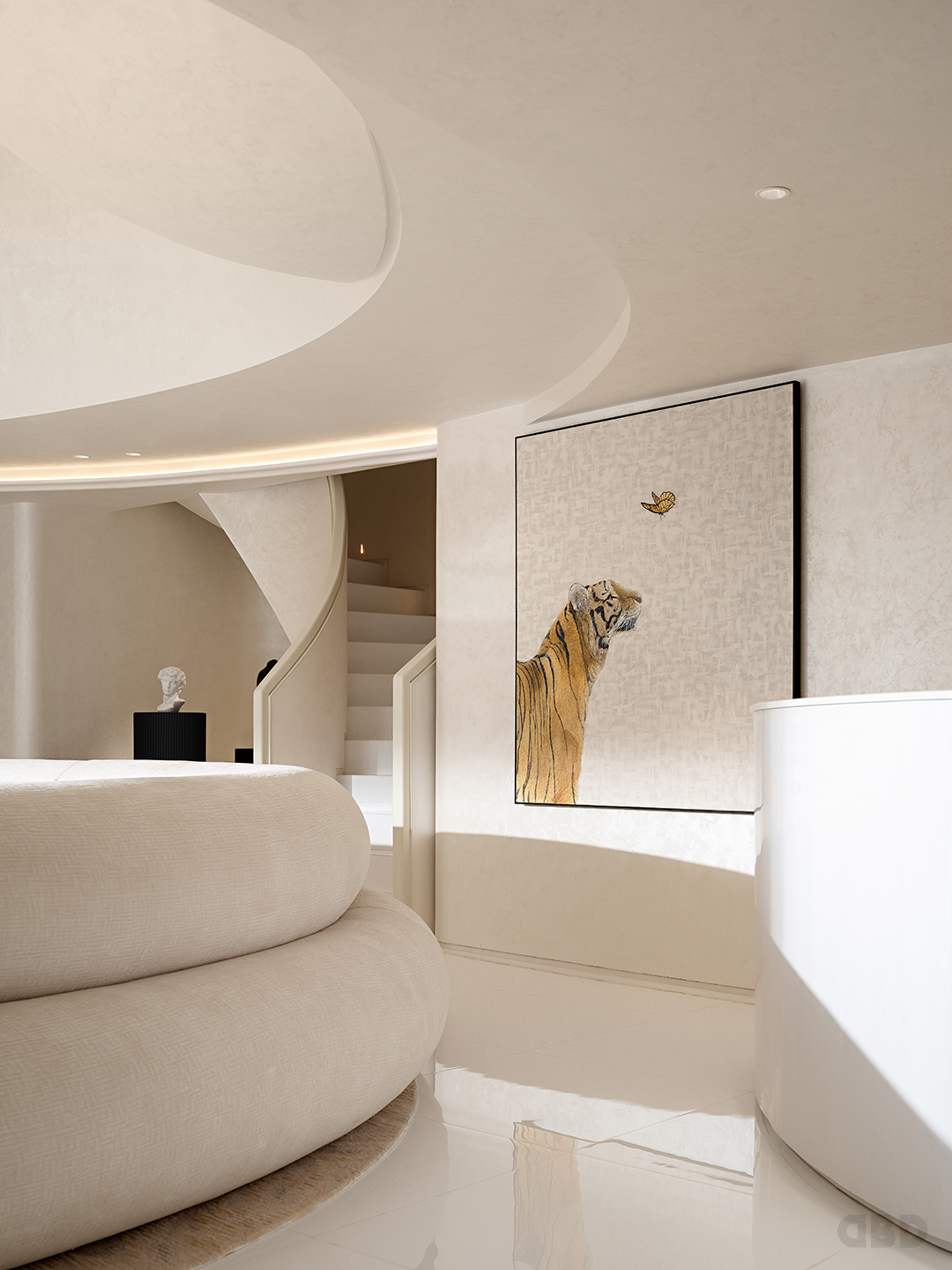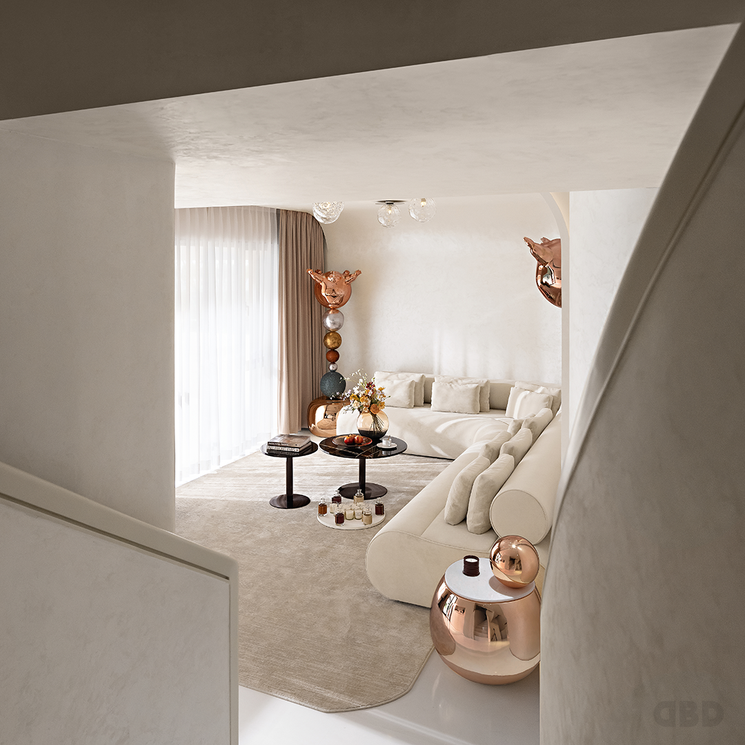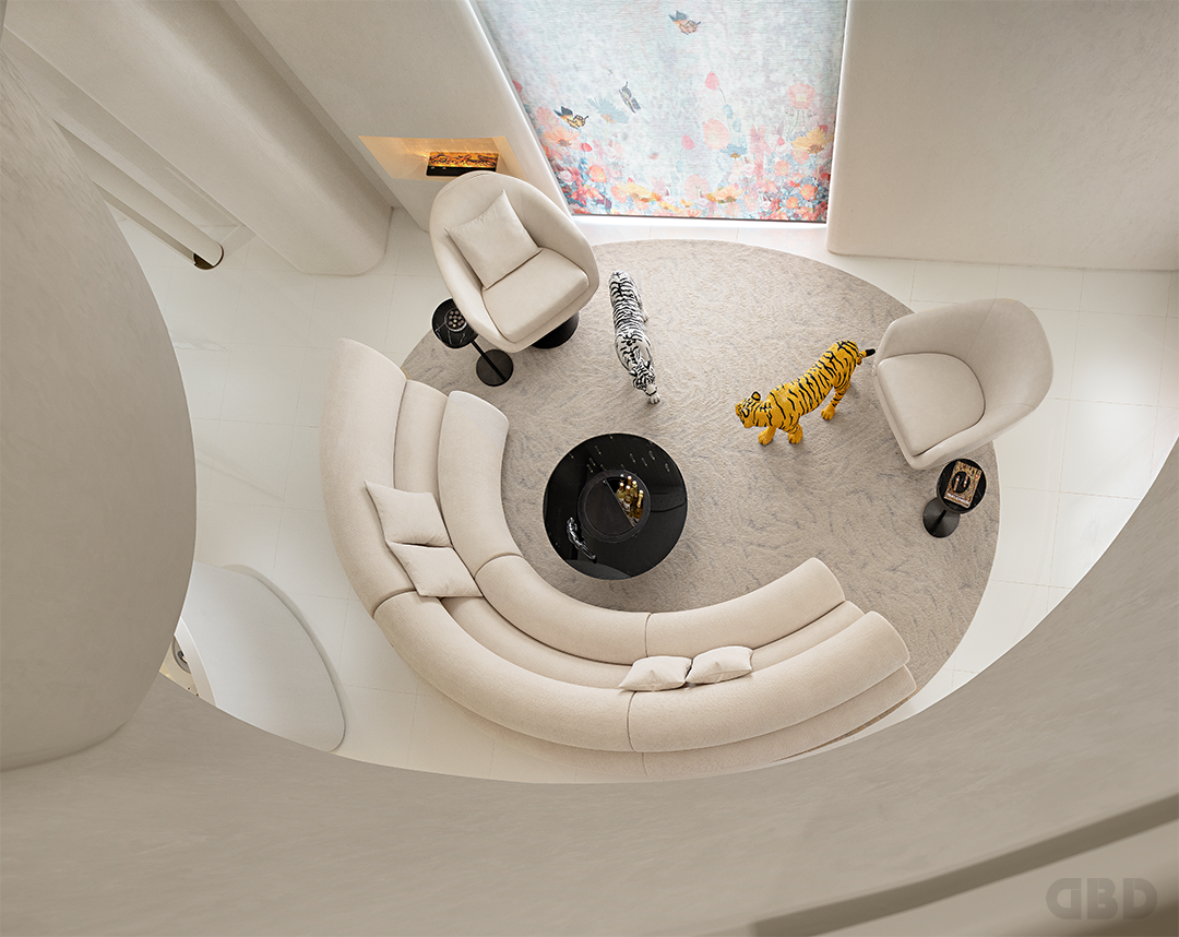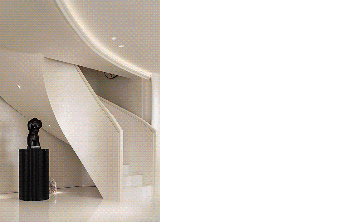 大面积的留白营造出适度的从容,沙发的弧线呼应了夹层底部天花的轮廓。墙体的结构模糊了空间的界线,在面与面的联动与延续中,制造出变化的层次感。